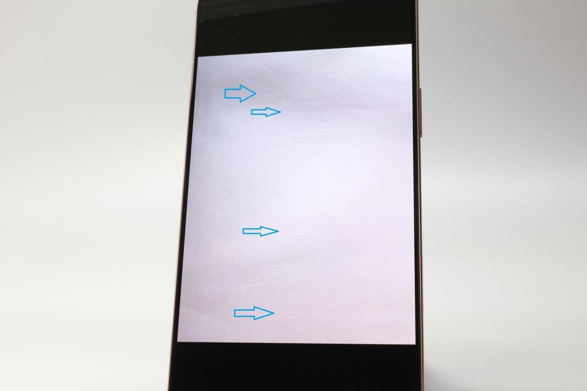 ・インカメラ撮影時、写真ともに横(青矢印)に光のラインが写り込みます(写真6 ※インカメラで撮影した写真を撮影してます)