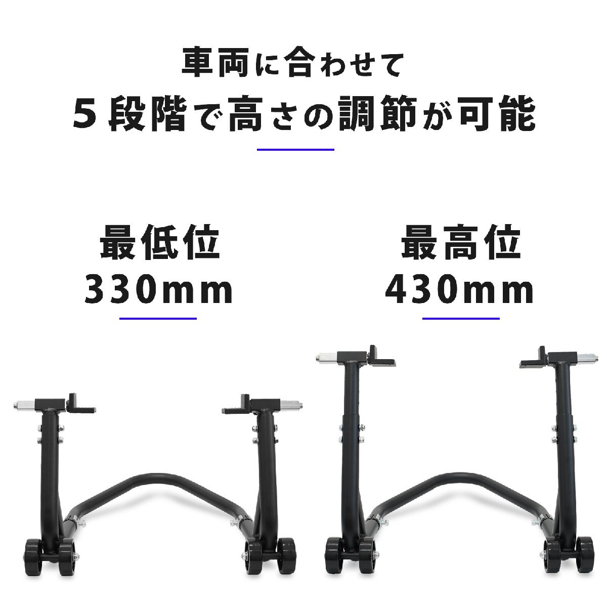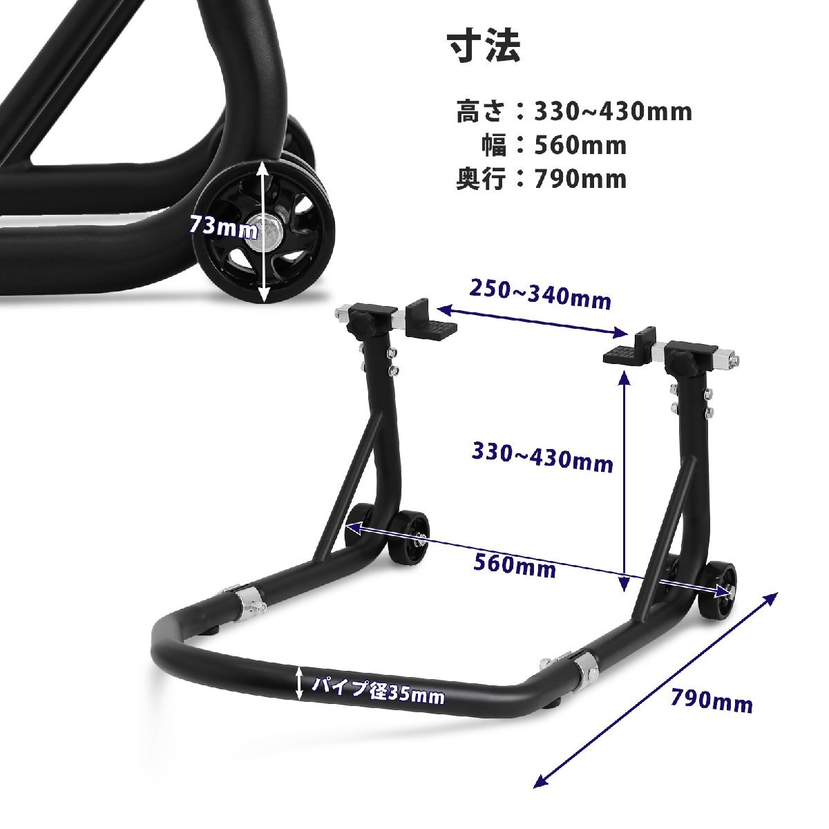 | 特 徴 | 高さは25mm刻みで5段階で調整が可能 スイングアーム幅は250~340mmの範囲で適合 車輪サイズは73×26mm 補強バーが付いていて、鉄製なので強度が抜群 マッドブラックで見た目がカッコいい |