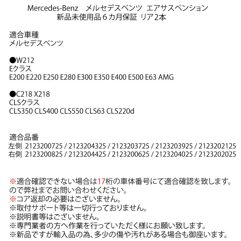 | 商品名 | メルセデス ベンツ W212 C218 X218 ベンツ Eクラス CLSクラス リア エアサスペンション エアサス 新品 即決 税込6カ月保証 送料無料 2本 左右 2123200725 2123200825 |