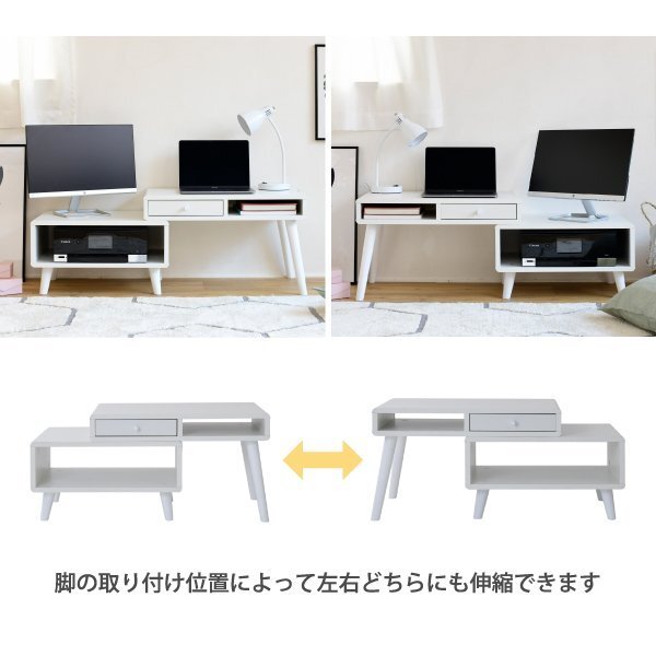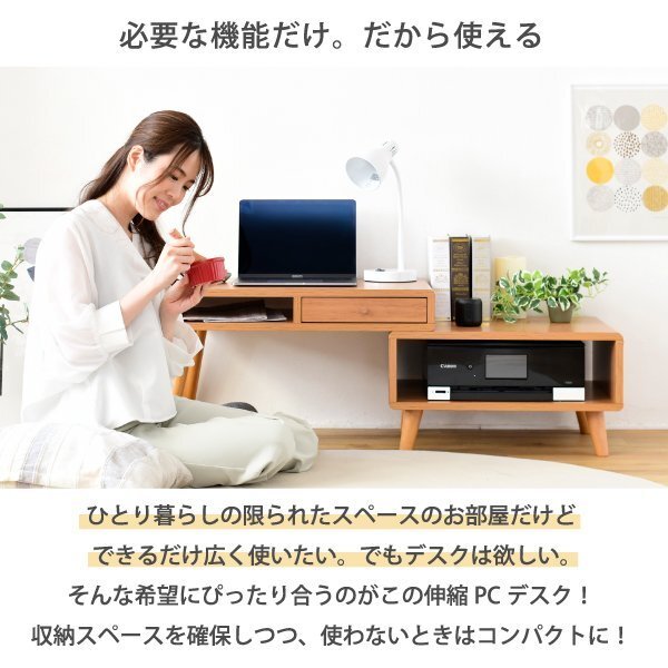 | 収納するものから設計されたデザインだから、コンパクトでも機能的。 使わないときは縮めて、使うときは伸ばして使える便利な伸縮タイプのデスク。 モニターやプリンターなどPC周りに必要なものも置くことができます。 丸みのある北欧風のデザインはとてもおしゃれで、ひとり暮らしのお部屋にもぴったりです。 |