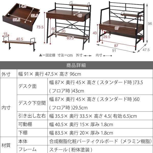 | 【カラー】 ブラウン 【サイズ】 <外寸> 幅91×奥行47.5×高さ96cm <内寸> デスク面:幅87×奥行45×高さ(スタンダード時)73.5(フロア時)43cm デスク下空間:幅87×奥行45×高さ(スタンダード時)60(フロア時)29.5cm 引き出し左右:幅35.5×奥行33.5×高さ4.5(有効6.5)cm 可動棚:幅40.5×奥行15×厚み1.8cm 下棚:幅83.5×奥行20×厚み1.8cm 【材質】 本体:合成樹脂化粧パーティクルボード(メラミン樹脂) フレーム:スチール(粉体塗装) 【耐荷重】 天板:(約)30kg以下 引き出し:(約)10kg以下/杯 可動棚:(約)3kg以下 下棚:(約)5kg以下 【生産国】 中国 【梱包】 サイズ:96×51×14cm、重量:23.5kg 【その他】 ・可動棚:1枚 ・背面化粧有り ・ハイ、ロー高さ変更可能 ・六角レンチ同梱 【組み立て品】 お客様による組み立てが必要です。 |