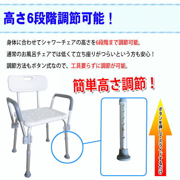 | 組み立てカンタン、工具不要になってリニューアル! 膝や腰の負担を軽減! シャワーチェア 高さ6段階調節 背もたれ2段階位置調節 ひじかけ付き 膝や腰への負担が少ない設計。 高さ6段階調節で体をしっかりサポート! ●立ち上がりの負担を軽減! ひじかけがあるから立ち上がりの負担を軽減します! ひじかけは握りやすく、滑りにくい素材だから安心。 ●高さ6段階調節 高さ調節に工具不要! ボタンを押してスライドするだけの簡単調節! ●シャワーチェアの仕様 1.座面は穴あき仕様で水が溜まるのを防ぎます。表面の細かい凹凸で滑り止め効果も。 2.背もたれに持ち手があるので運ぶ時に便利。背もたれは前後に2段階の位置調節が可能! 3.重量は約3.2kgでとっても軽い!女性の力でも軽々持ち運びが出来ます。 4.シャワーチェアの足先はゴム製で滑り止めや転倒防止になります。 | ||||||||