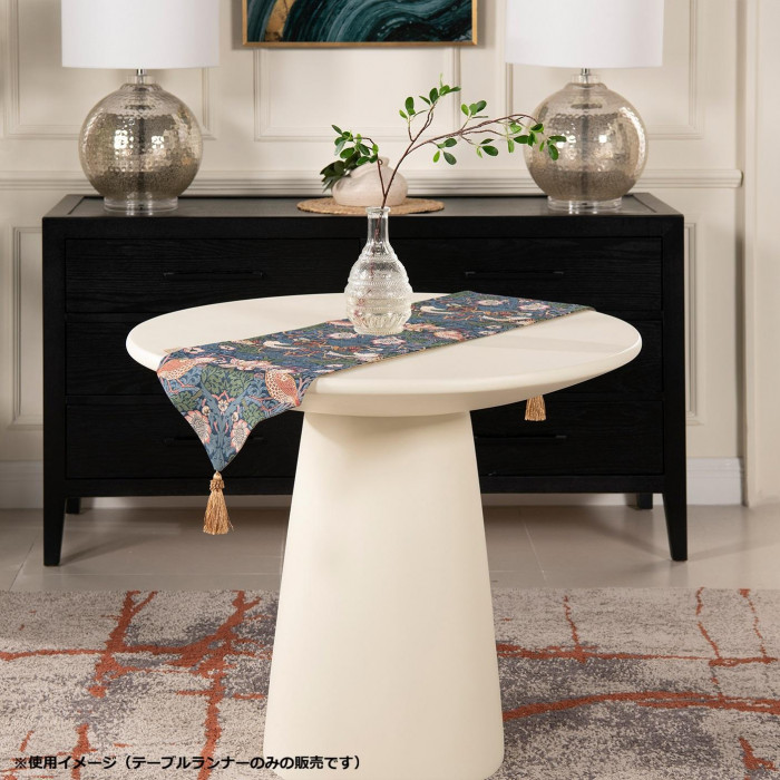 | ジェニファーテイラーとウィリアムモリスのデザインのコラボ。イチゴ泥棒の織生地が高級感を演出します。お部屋の模様替えで大活躍するテーブルランナーです。 |
