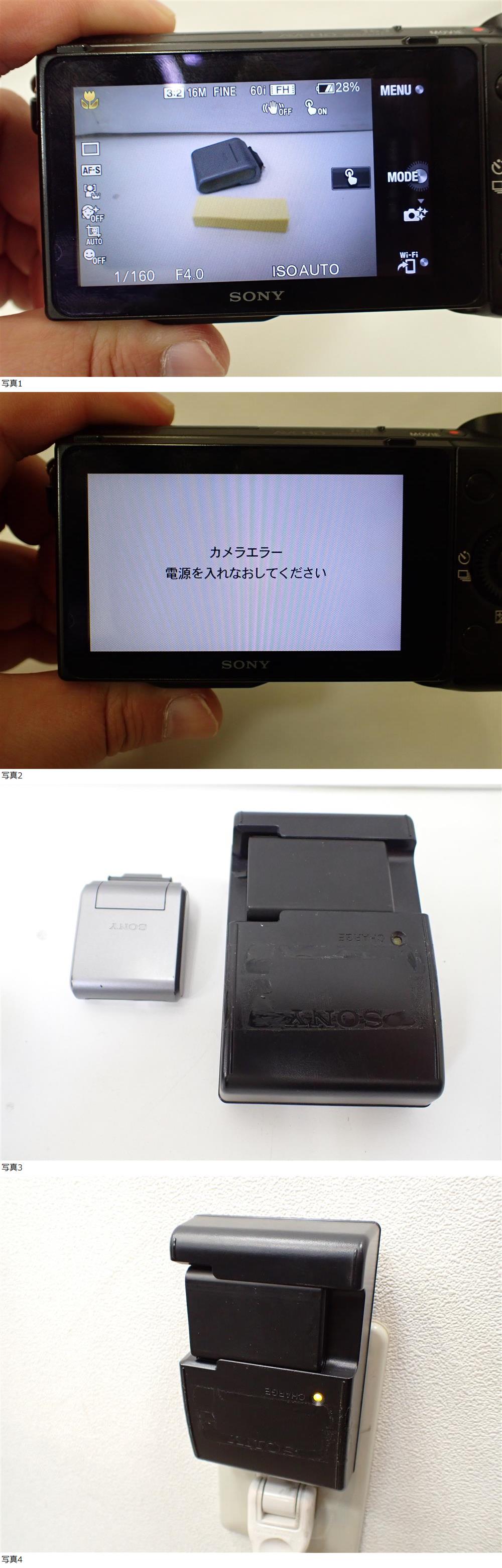 | 商品説明 | #44073【中古品】SONY ミラーレス一眼カメラ NEX-5R レンズ バッテリー付き ※側のシステム変更の影響により、送料連絡後の変更ができません。 必ずご希望の発送方法をご指定の上でお届け先情報の入力をお願い致します。※ ■商品詳細 中古品です。 通電・起動確認済。 シャッターをきると画像の様にエラーでます。 現状品としてご判断ください。 状態は画像にてご確認下さい。 あくまでも自宅保管品ですので、神経質な方、完璧を求められる方はご入札お控え下さい。 当方の動作確認済みとは「全ての動作を確認している」という意味ではありません。あくまでも素人レベルでの確認になります。 出品者の気付かないキズ・汚れ等あるかもしれません。 以上のことをご理解いただける方、画像を見てこのままで良いと言われる方のみ御入札下さい。 ◆◆画像をよくご確認いただき、配送方法、 配送時のトラブル(紛失盗難や雨濡れなどによる商品の損害) も含め完全ノンクレームノンリターンにてお願いいたします。◆◆ 当方商品に不案内なため、詳しいご質問には お答えしかねます。また、入札後や落札後に ご質問やご意見をされる方もよくいらっしゃいますが、 一切お断りいたします。即時落札者都合削除→非常に悪い評価 →ブラックリスト登録 以上の対応となります。 他、画像の通りとなります。 | |