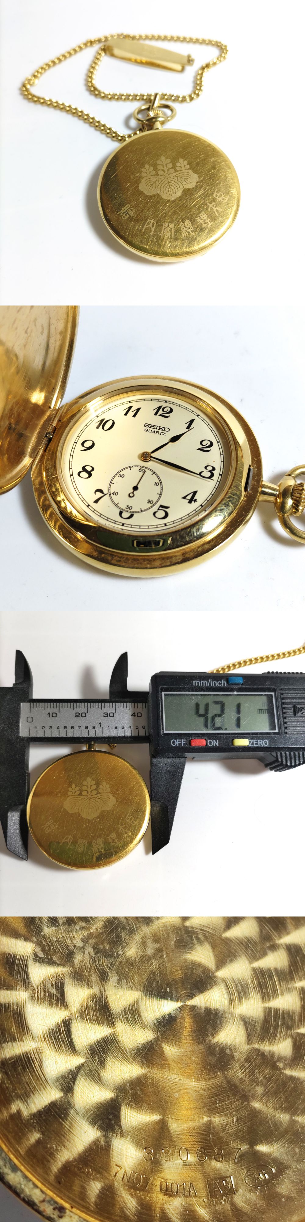 | ※必ず最後までお読みください。 Please be sure to read to the end. 一定要到最后※ | 商品概要 | 数あるオークションの中からこちらの商品をご覧頂きまして誠にありがとうございます! ※商品説明と注意事項を必ず全てお読み頂いた後にご入札下さい※ 引き続き 安心できる気持ちの良いお取引を心掛けてまいりますのでどうぞ 宜しくお願い致します! 色んなジャンルの商品を多数出品しておりますので、こちらをクリックしてご覧ください!! 東京都公安委員会 古物商許可 第307781505147号 ◎セイコー◎SEIKO QUARTZ 懐中時計 贈 内閣総理大臣 7N07-001A 金メッキ STANLEWSS STEEL ハンターケース 電池交換済 即発送 ※最下部にも写真掲載中なので必ずご覧下さい。 セイコーの金メッキの懐中時計になります。 表蓋付きのハンターケースで、裏面には日本国政府の紋章「桐紋」と贈 内閣総理大臣の刻印入りです。 直径42mmで、懐中時計としては小ぶりなサイズ感です。 ケースは金メッキで、表蓋の内側にはシリアルナンバーの刻印とうろこ状の模様であるペラージュ仕上げが施されています。 大きいアラビアインデックスを配した、視認性に優れたデザインが採用されています。 鎖と紐付きで、鎖の先端はクリップ仕様です。 薄くてスタイリッシュな懐中時計をお探しの方にオススメです。 この貴重な懐中時計をお探しの方、是非この機会にいかがでしょう(^_-)-☆♪ 【商品名】SEIKO QUARTZ 7N07-001A 懐中時計 【サイズ】横幅 42mm 【ムーブメント】クオーツ Cal.7NQ7A 【ケース】金メッキ仕上げ 【状 態】写真をご確認お願い致します。外観ランク:(A) 【詳細・備考】譲り受けたお品になります。また、タイトルや本文と写真が異なる場合は写真を正とします。 専門店ではない為、時計内部(回路)の状態は分かりかねますので不具合等での返品不可をご了承下さい。 中古品の為、検品時や出品時は稼働していても到着後停止している可能性がございます。 OH歴が不明なため、上記ご了承の上、メンテナンスや修理などはお客様ご自身でお願い致します。 状態判断には個人差があることを予めご了承の上 写真にてご確認ご判断お願い致します。 写真に写っている物が全てになります。 尚 デジカメの画像は鮮やかになりますので、 実際のカラーとモニターを通じた色彩は異なりますのでお気をつけ下さい。 よくご確認、ご了承の上、ご入札お願い致します。 ●外観ランク表記● 【N】新品、未使用品 【S】数回程度使用の美品 【A】多少の傷、若干の使用感がありますが程度良好の美品 【B】一般的な使用感あります。 【C】汚れ、使用感を感じるがまだまだ使える品物 【D】汚れ、使用感等が見受けられる難有品 【E】ジャンク品 ※大体の目安としてお考え下さい。 新品に近いものをご希望の方や神経質な方のご入札はお控え下さい。 ご入札頂いた時点で商品にご納得して頂いたと当方で判断させて頂きます。 【ノークレームノーリターンでお願い致します】 【当方のオークションでは いろんなジャンルで多数出品しております】 是非ご覧ください☆ ![]() ▶入札の取り消しは受け付けておりません。 落札後の質問やキャンセルは受け付けておりません。 オークション終了間際や質問内容によっては返答できない場合がございます。 ジャンク商品に関してはいかなる場合も返品返金の対応はできかねます。 落札後のサイズ違いやイメージ違い等のキャンセル、クレーム、返品等はお受けできませんので予めご了承ください。 ご入札の方につきまして、当方にて評価が著しく悪いと判断した場合は、トラブル防止の観点からご入札を取り消させていただく場合がございますので予めご了承ください。 新規IDの方や、いたずら入札と判断した場合、入札削除させていただく場合がございますので、 新規の方は質問欄にて購入意思を示してからのご入札をお願い致します。 取り置きは可能ですが物や金額によってはすぐに決済をお願いする場合がございます。 当方大量の商品を管理している為、複数落札の同梱ご希望の方は、まとめて取引の依頼を必ず使ってください。 ◆連絡方法◆ ▶当方連絡事項は全て取引ナビを使用しております。 ご連絡先、ご要望等は必ず取引ナビにご入力お願い致します。 ⇩⇩下記の注意事項を必ずお読み下さい。⇩⇩ |