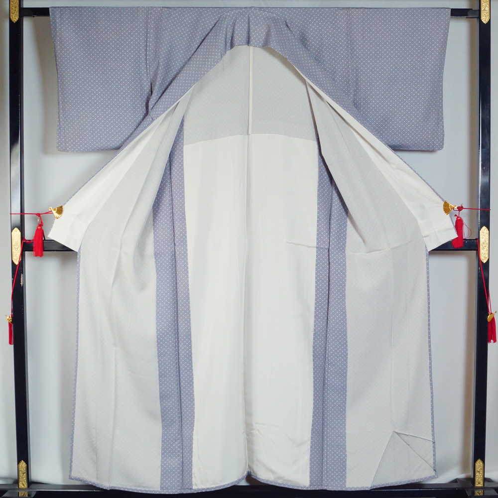 | 商品説明 | シックな青藤色系のちりめん地に、菱模様が染められた単衣の小紋です。 |