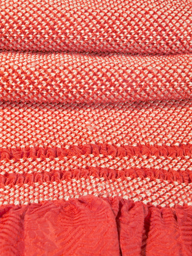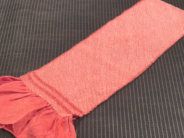 やや沈んだ銀朱色の地に本紋(紗綾形に花)の地紋が織り出され、鹿子(かのこ)の総絞り染めが施されている、駒綸子(りんず)の帯揚げです。 ユーズド品と思われますが、使用感はほとんど感じられません。目につくしみやよごれ、褪色などのダメージはなく、きれいな状態です。 |