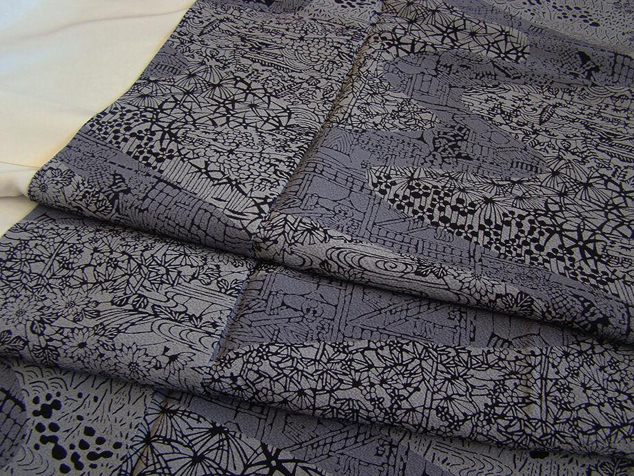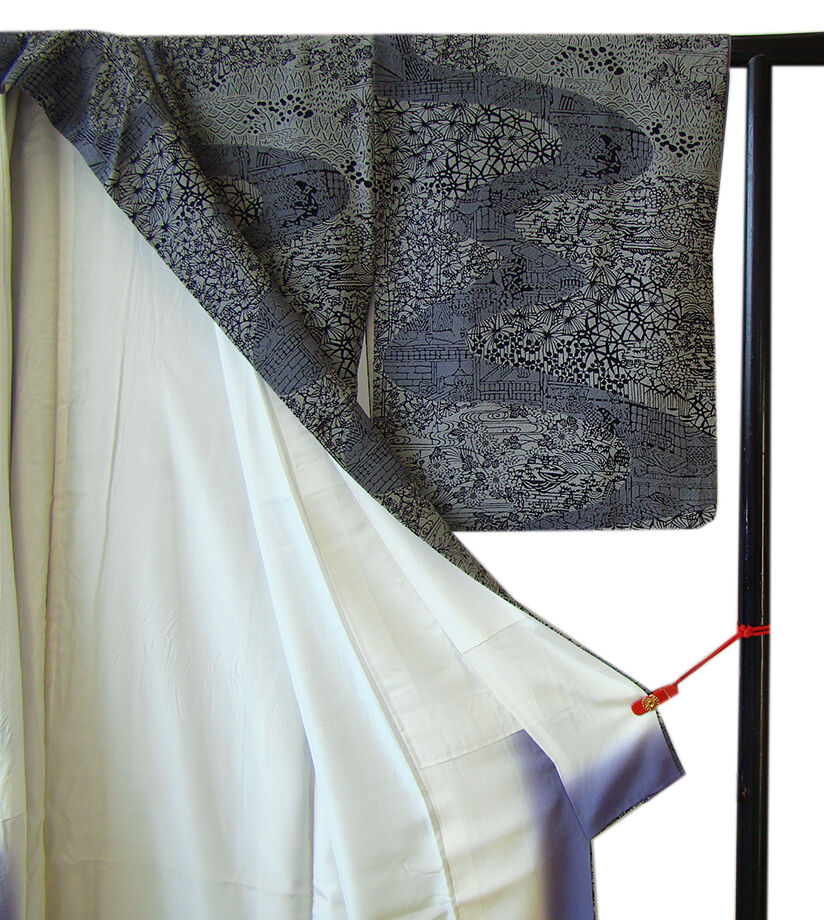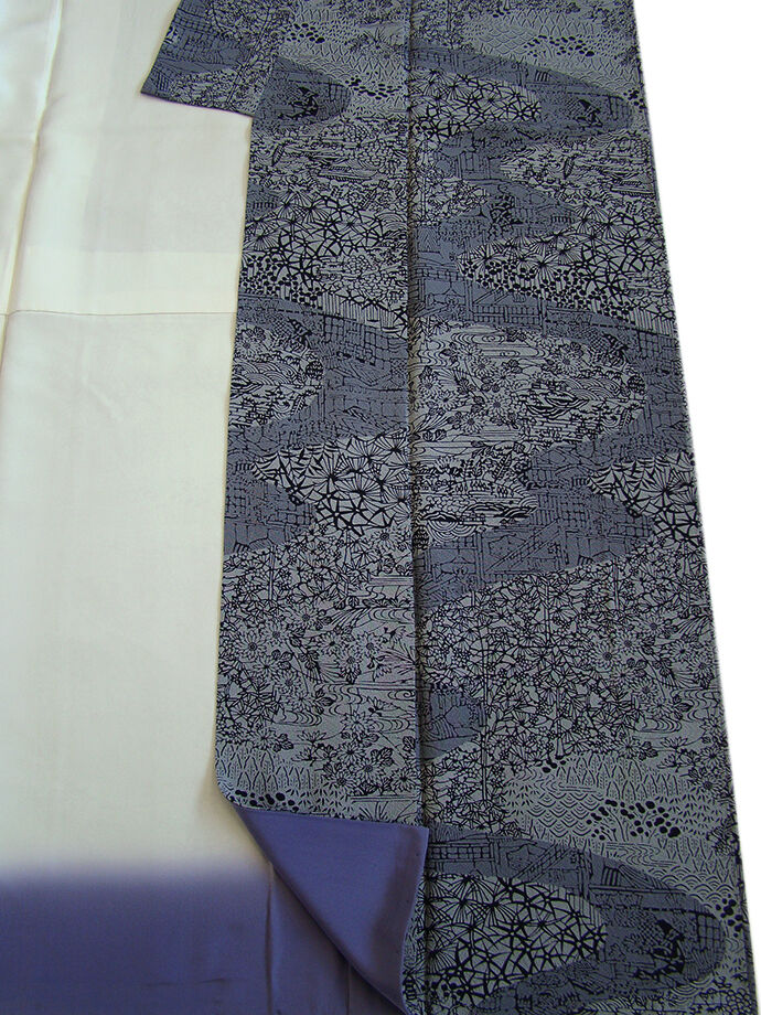 | 商品説明 | こちらのお品は「袷」ですので10月から5月までお召頂ければと思います。 しなやかなさらりとした手触りの着心地良い重めの極上ちりめん地の生地、 源氏鼠色地にグレー色の流れぼかしに、黒色の流水、青海波、花草柄等の染柄、 八掛は藤紫色(正絹)、幅広い年代の方にお召頂けます。 |