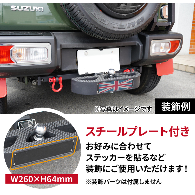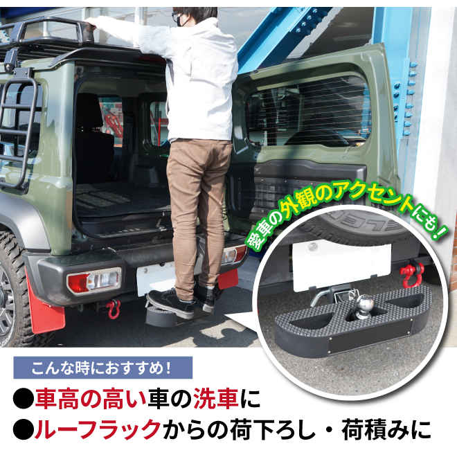 ・ルーフラックへの荷物の積み下ろしや洗車時などに便利なステップ ・2インチサイズのヒッチメンバー装着車に取り付け可能です ・愛車の外観のアクセントに! ・スチールプレートが付いており、ステッカーを貼るなど装飾にご使用いただけます ※ステッカーなどの装飾パーツは付属しません ・ステップ部はPVC素材なので、比較的軽量になっています ・ステップの表面は凸凹になっており、雨の日に濡れた靴で乗っても滑らないので安心です ・2種類のロックピンが抜け防止対策に! ・パイプ肉厚は5mmで丈夫な作りになっています ・ステップを取り外すとトレーラーヒッチとしてトレーラーなどの牽引にご使用いただけます ( 牽引最大荷重:約2270kg ) |