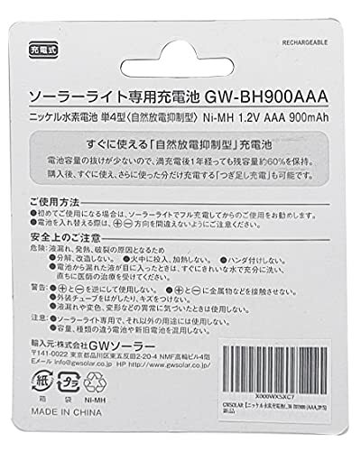 | 商品名 | GWSOLAR ソーラーライト交換用 電池 充電池 単4形 900mAh 2本組 ニッケル水素充電池 単4 充電池 【ソーラーライト交換用型番 | ||