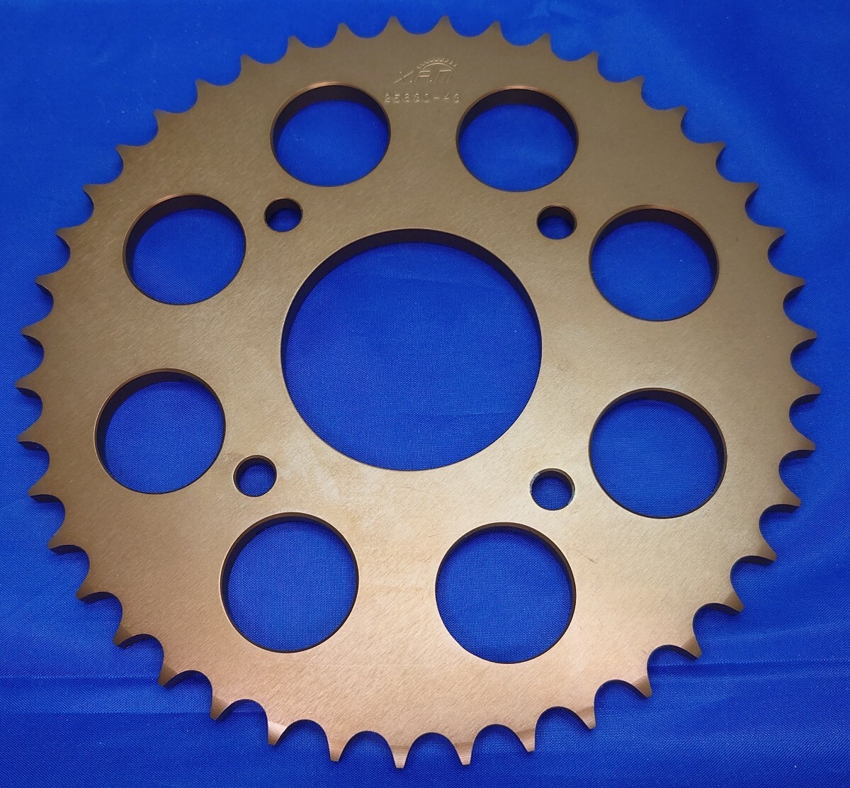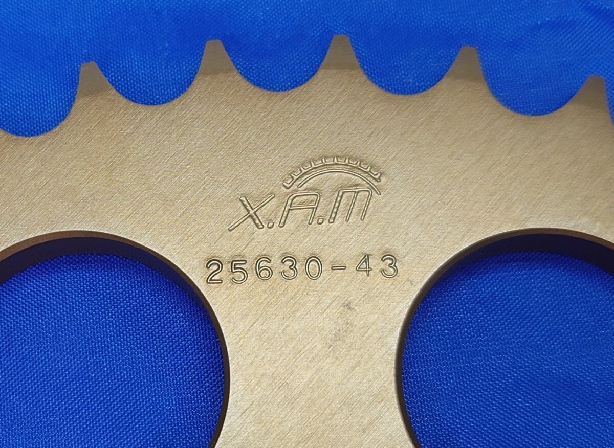 XAM製428-43T特注品(品番:25630-43ブラウン)です。A7075にT6加工(硬化熱処理加工)した超々ジュラルミン素材にカラーアルマイト処理を施したリアスプロケットです。取付においてはチェーンの長さも調整する必要がでる場合があるのでご注意ください。国内外、年式によってスプロケットの形状が違う場合がありますので、写真の形状と取付予定のバイクのスプロケットの形状を良くご確認のうえ、お間違いの無いようにお願いします。取付部の寸法は、PCD(対角の取付穴間)90mm、センターホール58mm、取付穴は8mmの4穴です。※CB125Tはスプロケット取付ボルトが8mmと10mmの2仕様があるようなので、取付予定のスプロケット取付ボルトの径を必ず確認の上ご入札ください。具体的な適合は