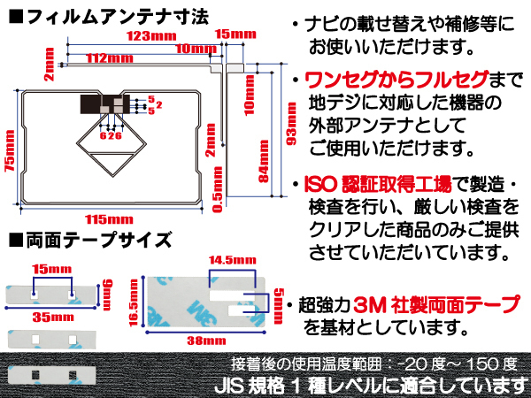 ◆注意事項 供給元の都合により赤い両面テープの場合がございますが、使用上問題はございません。 ご自身のアンテナ形状をご確認いただき、画像寸法を確認の上御購入いただきますようお願い致します。 受信感度の保障はしておりません、不安な方はメーカー純正品をご購入下さい。 電波を通しにくいガラスやフィルムを貼り付けたガラスでは受信感度が低下する場合があります。 天候・場所等により受信感度が悪くなる場合がありますが異常ではありません。 車種ごとの取付説明書はございませんのでご了承ください。 この商品はフィルムのみとなりますアンプコードは付属しておりません。 電波の受信感度の向上を保証するものではありません。 ワンセグの機種をフルセグにすることは出来ません。 メール便発送の場合、万が一エレメントが折れたり曲がったりしていましても保証がありませんことをご了承の上ご購入願います。 新品未使用品ですが外観の汚れ保管の際の傷等がある場合がございます。 メール便での発送は厚み制限の関係上製品をそのまま封入する場合があります。御了承ください。 外観の傷、商品の若干の傷等は使用上問題ありませんので、ご容赦ください 完璧を求める方、極端に神経質な方の購入はご遠慮ください 写真はイメージです 写真と実際の商品の外観が予告なく変わる場合がありますが、使用には問題ありませんのでご理解ください ブラウザの関係で実際の色とは異なる場合がございます 保証についての詳細はこちらをお読み下さい。 https://labo1.net/hosyou/komono.html 本商品は到着後7日間の初期不良対応が適用されます 加工および一度使用した商品、フィルムを剥がした商品の返品及び交換には対応できません (到着後すぐに目視にて商品をご確認ください) ノーサポート商品です。 ご自身で取り付けできない場合は専門の知識を持った専門店で取付けを行うことをお勧めいたします ◆免責事項 法律上の請求原因の種類を問わずいかなる場合においても、 購入した製品自体、または製品の使用から生じた直接的、間接的な損害に関して、 弊社はその一切の責任を負わないものとします | ||