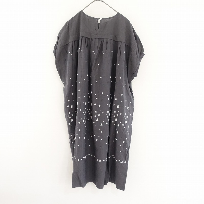 | mina perhonen laundryのhoshi hana 刺繍ドレスワンピースです。カラーはダークグレー×ホワイトで、薄手地に刺繍があしらわれております。トップ切替下にギャザー入り、バック襟元のボタン開閉のプルオーバータイプで、両サイドにシームポケットが付いております。定価(メーカー希望小売価格)47,300円 税込みの商品です。 |