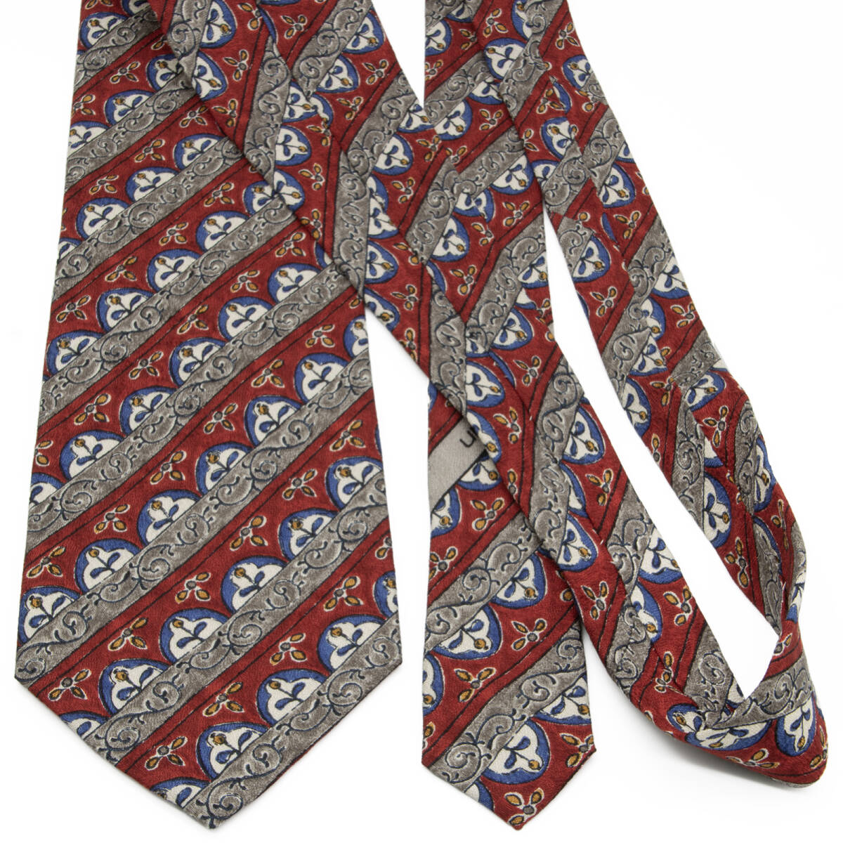 情熱的なレッドと、落ち着いたグレーのストライプの中に、まるで古典芸術のような緻密な模様が織りなす、大変格調高い一本です。