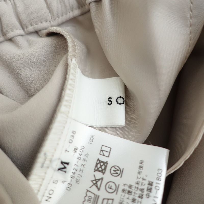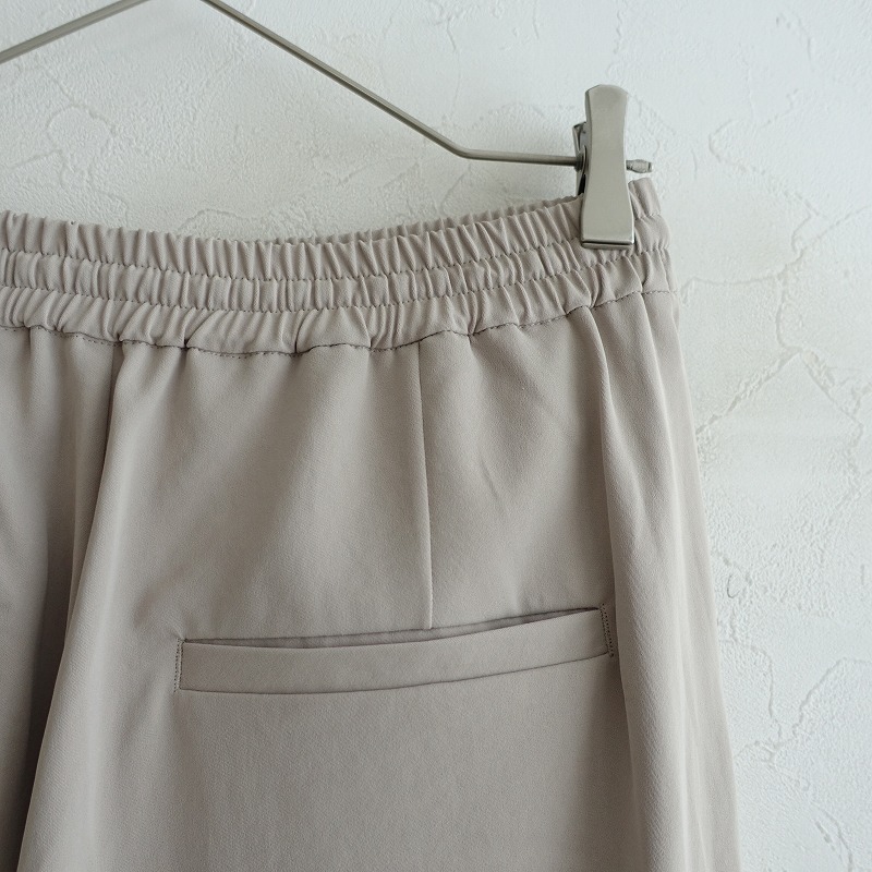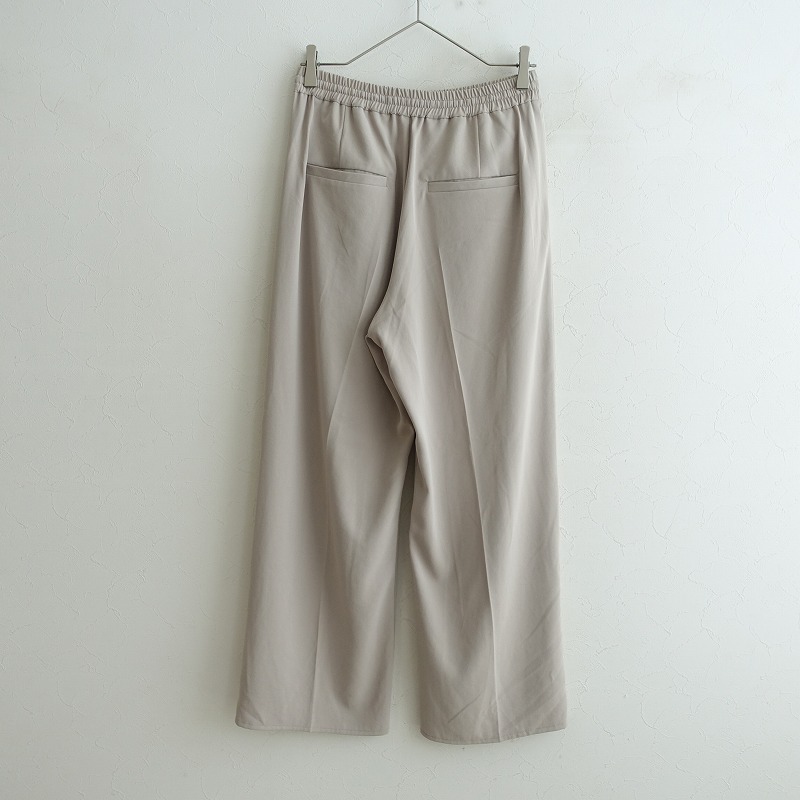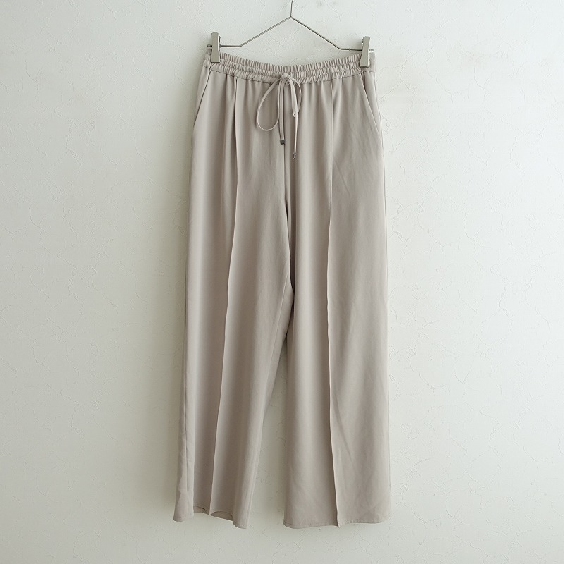 | SOEJUのタックパンツです。カラーはグレージュで落ち感のある生地で仕立てられております。ウエストはゴム&ひも入り、センターラインにタックが施されたワイドなシルエットになっております。ポケットは4つ付いており、定価(メーカー希望小売価格)13,200円 税込みの商品です。 |