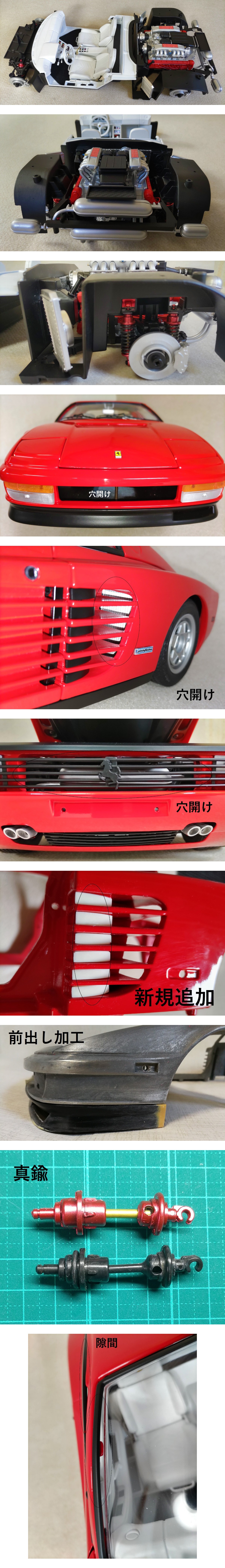 ●テスタロッサ● 1/8 ポケール フェラーリ 穴アケ加工 商品説明☆☆☆☆☆ メーカー:ポケール。 型番:フェラーリ テスタロッサ。 スケール:1/8 全長56cm 幅26cm 重量 重いです。 付属品:取扱説明書(コピー)・エンブレム・ミラー左右・ホイールキャップ4つ・鍵・ 自作アルミ鍵(ドア開閉用)・リアバンパー パーツ・補修用塗装瓶(マツダM-510)楊枝などでちょんと...。 梱包:収納プラスチックケース底部に発泡スチロールを敷き、お車が動かない様 に心がけますが、輸送の際に塗装が欠けたり、シール・パーツハズレ などの可能性がご座いますのでご了承下さい。 制作工程☆☆☆☆☆ ★各部パーツ合わせ・研磨。 ★穴アケ:フロント・リア・サイドインテーク。 ★塗装:部分剥離・サフェーサー・カーペイント・ウレタンクリアー・水研ぎ。 ★その他:窓などクリアーパーツ新品・Fスポイラー前出し・サスペンション6本に真鍮など。 おしらせ☆☆☆☆☆ ※ほとんどのパーツに塗装をしましたが研ぎスレ・チリ・タレなどご座いますのでご理解いただけますと幸いです。 ※歪んでいるパーツなど有りますので、取り付け場所の変更がご座います。 また、ドアなど綺麗に収まらないパーツも有ります。 ※ほとんどのパーツはハメ込みや粘着ゴムなどで留めてありますので外れやすくなっており、ワイパーはブラブラです。 ※エンブレムは複製した物でとても壊れやすいので、ピンセットなどでツマンデお持ちください。 ※※ご不明やご質問などご座いましたら、お気軽にご連絡下さい。 ●ありがとうございました● | |||