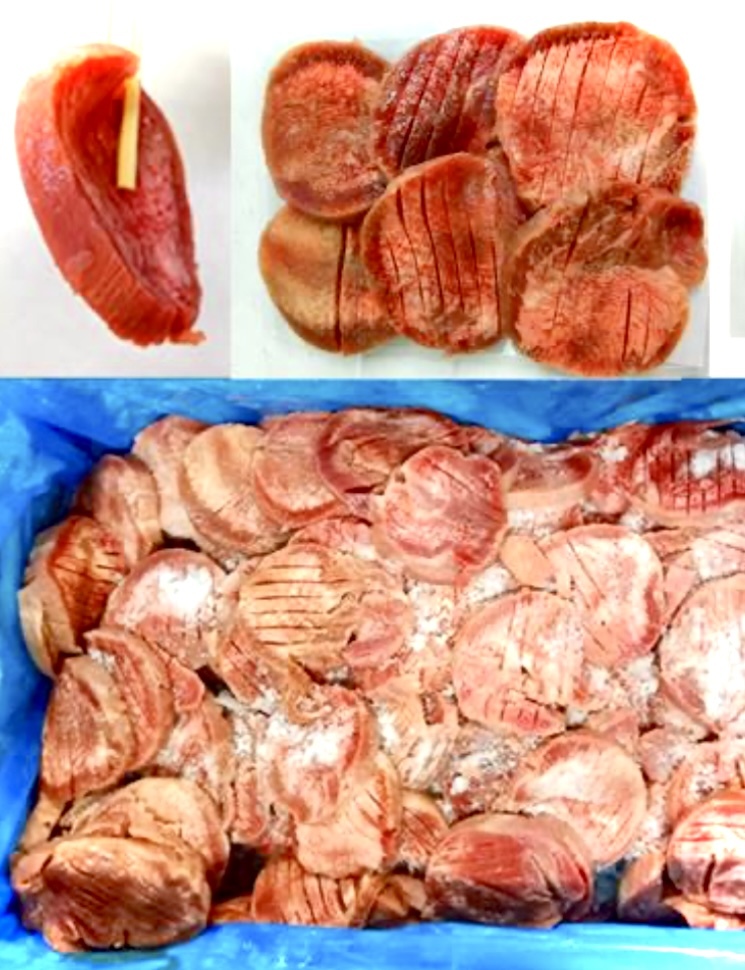 | 原材料: | 牛タン(ポーランド)、食塩、ぶどう糖、卵粉末、コショウ/リン酸塩(Na)、pH調整剤、調味料(アミノ酸等)、ソルビット、増粘多糖類、(一部に卵、牛肉を含む) |