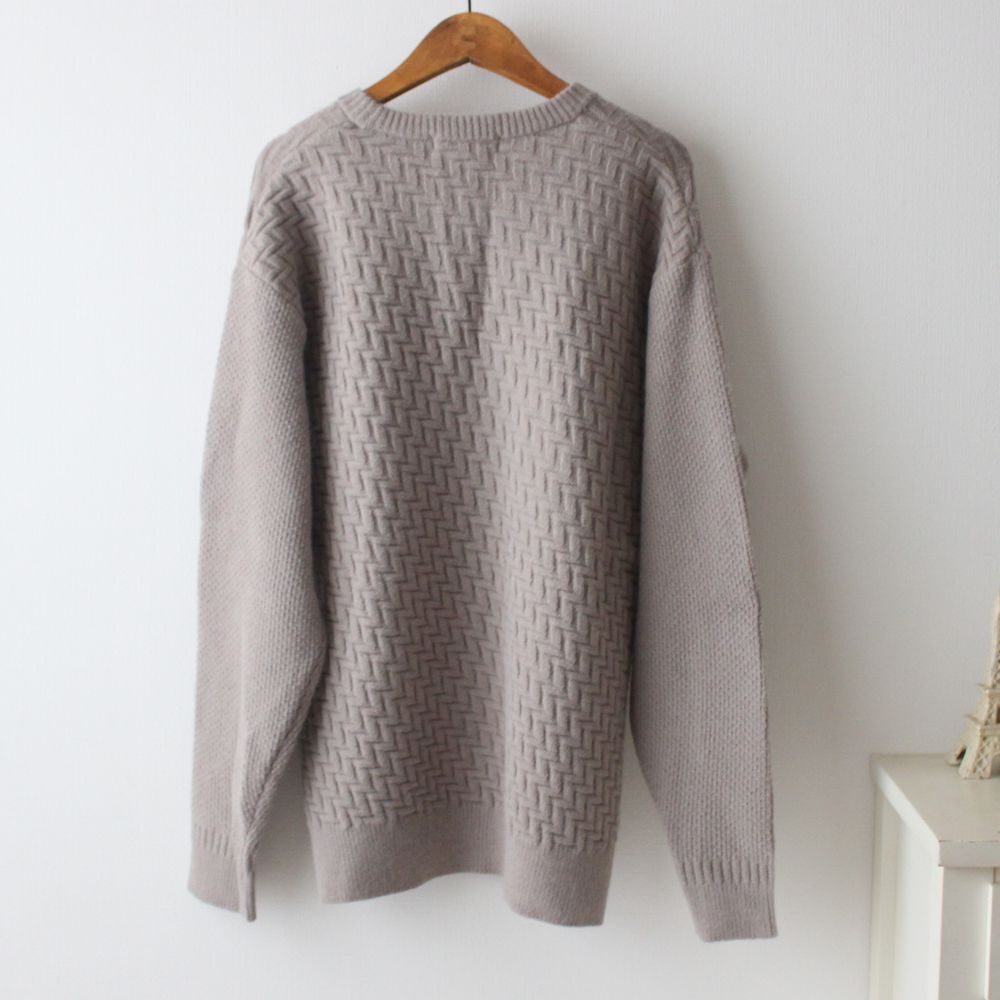 <商品> 新品 タケオキクチ THE SHOP TKのニットです。メーカー表記カラーはベージュです。 伸縮性の高い特殊なポリエステルを糸に混紡させることで、型崩れのしにくい形状安定を追求したニット。 温かみのある素材は、寒い冬を乗り切るためのヘビーローテーションの一枚になること間違いなしです。 特徴のある幾何学柄をバスケット状に編み込むことで、立体感を出しています。 無地テイストではありながら存在感たっぷりで、一枚着でサマになるニットです。 |