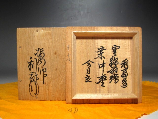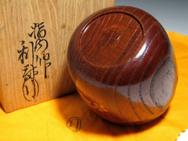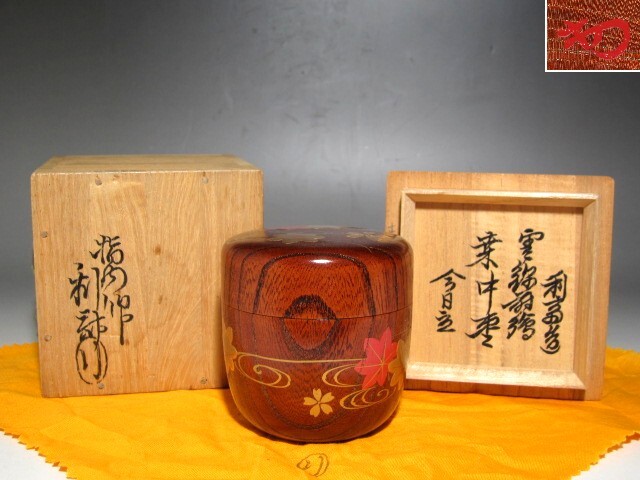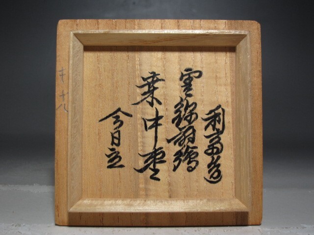 千家十職駒沢利斎作の雲錦絵桑中棗です。 上品で趣のあるお品です。 蓋裏に裏千家十四世淡々斎花押のある名品です。 【駒沢利斎(こまざわ りさい)】 千家十職の一つ。三千家御用達の棚や香合、炉縁などを製作する指物師が代々継承する名跡である。 当代は14代が1977年(昭和52年)に逝去後、長く空席が続いており、14代の甥の息子である吉田博三が後を嗣ぐべく修行中である。 サイズ 直径6.8cm/高さ7cm(多少の誤差はお許しください) 状態 一見して疵やヒビ・直しは見られません。 骨董品という事をご勘案頂き、時代経過のスレや、小さな傷がある場合があるかもしれませんのでご承知置きください。 | |||