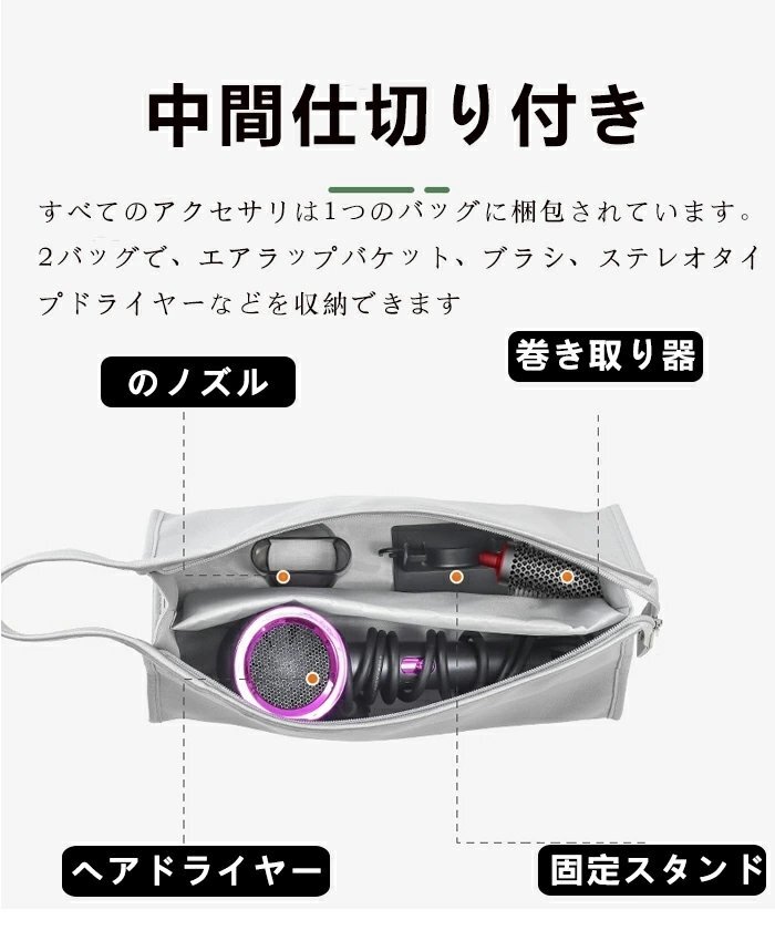 【抜群な収納力】すべてのアクセサリは1つのバッグに梱包されています。 複数の個別のバッグで、エアラップバケット、ブラシ、ステレオタイプドライヤーなどを収納できます。