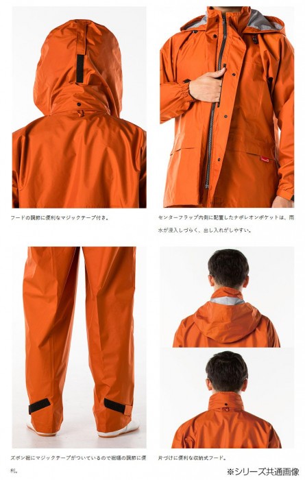 | 仕様 | 耐水圧:20000mm(初期値) 透湿度:10000g/m2・24h(初期値) ・防水加工 ・撥水加工 ・襟収納式フード ・前開きパンツ ・ナポレオンポケット (ファスナー付き内ポケット) ・両腰ポケット ・収納袋 |
