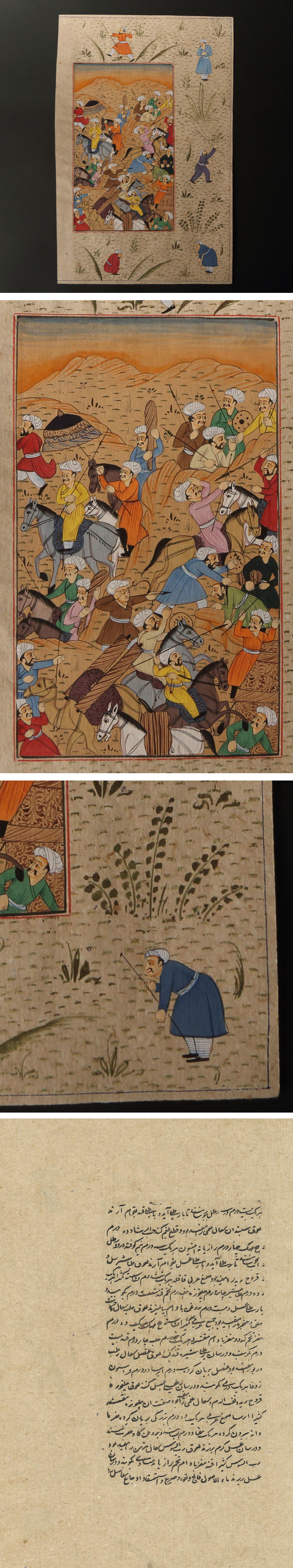 ムガル帝国期の彩色ミニアチュールです。 棍棒や弓矢、槍を手にし乱戦する兵士たちを描いております。しかし裏面は石菖を用いた薬品の調合法をペルシャ語で記した古写本とみられ、実は枠外に描かれた野山を逍遥し薬草を採取する人々が写本の主題であることがわかります。 インドとペルシャの折衷的な様式がみられる、華やかな色彩の逸品です。 寸法:縦33.5cm、横21.5cm(最大幅。若干の誤差はご了承下さい) 状態:経年感がございます。 |