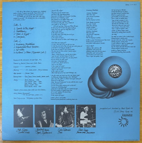 【 収録曲 】 A1. Spirits In The Night (6:26) A2. Countdown (3:06) A3. Time Is Right (6:33) A4. Crossfade (3:39) B1. Visionary Mountains (5:42) B2. Nightingales And Bombers (4:52) B3. Fat Nelly (3:20) B4. As Above So Below (Live) (4:15) Total time 37:53 【 Line-up / Musicians 】 - Mick Rogers / guitar, vocals - Manfred Mann / organ, synth, co-producer - Colin Pattenden / bass - Chris Slade / drums, percussion With: - Martha Smith / backing vocals - Doreen Chanter / backing vocals - Ruby James / backing vocals - Chris Warren-Green / violin - David Millman / viola - Graham Elliott / cello - David Boswell-Brown / cello - Nigel Warren-Green / cello ※チャプター・スリーで2枚のアルバムをリリース後、盟友マイク・ハグと袂を分かったマンフレッド・マンが新たなメンバーを集めて結成したマンフレッド・マンズ・アース・バンドの75年発表の6作目のアルバム。 ブルース・スプリングスティーンの「スピリット・イン・ザ・ナイト」のカヴァーがアメリカでヒットを飛ばした。 前作で築いた良質なポップ性とキャッチーさを加えたアレンジは更なる洗練度を増し、アース・バンドの全盛期の一枚に数えられる名作品。 ( diskunionより ) 【 参考音源 】 Nightingales & Bombers (1975) |