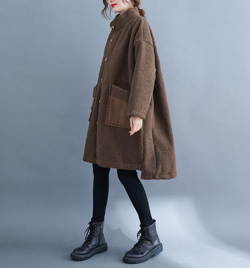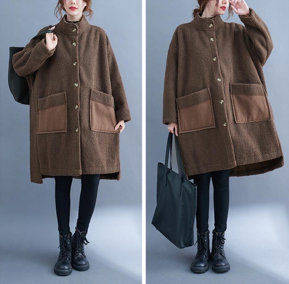カジュアル ゆったり 大きいサイズ レディース ロングコート オシャレ 厚地 暖かいアウター★コーヒー /Lサイズ