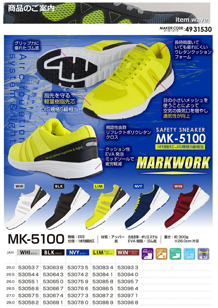 喜多 KITAMK-5100 LIMカラー ライムグリーンMARKWORK■グリップ力に優れたゴム底■指先を守る軽量樹脂先芯 JIS規格S級相当■視認性抜群 リフレクトポリウレタンクロス■クッション性EVA発砲 ミッドソールで疲労軽減■長時間履いていても疲れにくいウレタンクッションフォーム■目の小さいメッシュを使うことによって空気の換気口を増やし通気性が向上・靴幅:EEE・材質:アッパー/合成皮革・ポリエステル 底 /EVA樹脂・ゴム底・重さ:約300g※26.0cm片足・仕様:つま先鋼先芯