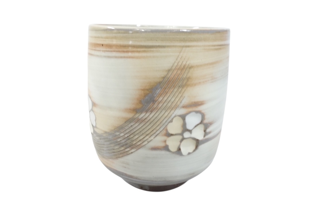 流麗な筆致で描かれた桜文様と灰釉の流れ模様が魅力的な夫婦湯呑セットです。