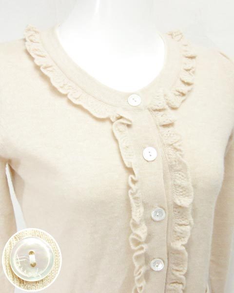 | 上品フェミニンなハロッズのカーディガン。お首周りや前立てなどにほど良いフリルが施されていて適度なフェミニンを取り入れつつハロッズらしさが出ています。フレアースカート、タイトスカート、マーメイドラインなど幅広くコーディネートして頂けます。あわせやすいデザインですので、1枚あると便利。ボタンには1つ1つブランドロゴがデザインされていて、細部までのこだわりが感じられます。 |