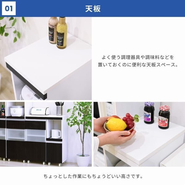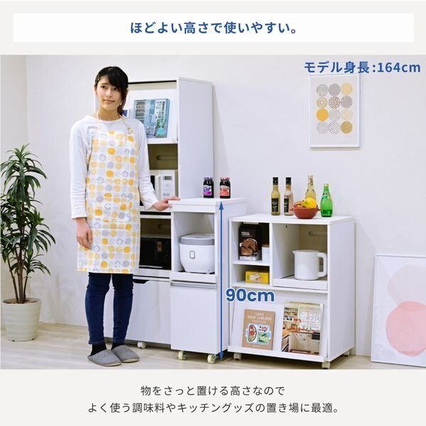 | 家電の収納に便利なコンセント付きスライド棚と、収納物に合わせて高さ調節ができる可動棚付きの食器棚をこれ1台で。 ロータイプは天板も使いやすいちょうど良い高さ。 キッチンのちょっとした隙間に設置すれば、それまでのデッドスペースを有効活用できます。 |