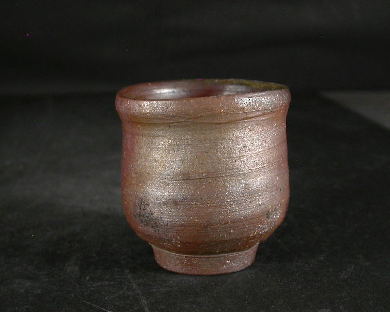 昭和9年備前市生まれ。岡山県無形文化財伊勢崎陽山の長男で人間国宝伊勢崎淳の兄。幼少より父を手伝い陶技を学ぶ。金重陶陽賞他受賞歴多数。岡山県無形文化財。このぐい呑は雰囲気のある作りに、焼けは良く焼き締まった地肌に黄・焦げ茶のゴマが掛かり良い雰囲気の作品となっています。共箱に自然の焼けが有ります。高さ約5.7センチ、径約5.6センチ。共箱付き。