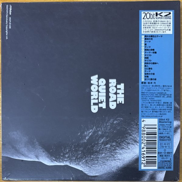 【 収録曲 】 01. The Great Birth - 偉大な誕生とテーマ 2:25 02. First Light - 最初の光 3:33 03. Theme - テーマ 0:42 04. Star - 星 2:28 05. Theme - テーマ 0:50 06. Loneliness And Grief - 孤独と悲嘆 5:05 07. Theme / Change Of Age - テーマ〜年輪 1:26 08. Christ One - キリスト 5:31 09. Hang On - 持梳 1:15 10. Christ Continued - キリスト 3:21 11. Body To The Mind - 肉体から精神へ 2:57 12. Traveller - 旅人 2:35 13. Let Everybody Sing - 心に歌を 1:52 14. Theme - テーマ 0:25 15. Children Of The World - 世界の子供 2:12 16. Change Of Age - 年輪 0:34 17. Love Is Walking - 近づく愛の姿 3:38 Total Time 40:44 【 Line-up / Musicians 】 - Steve Hackett / electric & acoustic guitars, harmonica - John Hackett / acoustic guitar - Gill Gilberts / vocals - Sean O'Mally / drums - Eddy Hines / flute, saxophone - Dick Driver / string & electric bass - Phil Henderson / arranger, piano, trumpet, organ, recorder, vocals - John Heather / composer, acoustic guitar, vocals - Neil Heather & Lea Heather / composer ※クワイエット・ワールド・オヴ・リー&ジョンとして1枚のシングルを発表した後にリリースされたクワイエット・ワールドの唯一のアルバムである。70年という制作年度を考えると、極めて斬新かつプログレッシヴな作品と言える。一部ジャズィな箇所もあるが、大部分でクラシカルかつメロディアスな演奏が展開されている。オーケストラの使い方が非常に効果的であり、彼らのプレイを見事に盛り上げている。また、コーラス等を用いたヴォーカル重視の音作りも特色の一つである。「ザ・ロード」というアルバム・タイトル及び胎児と老人を描いたジャケットからも分かるように、人生をテーマとしたトータル作品である。更に、本作はスティーヴ・ハケットのファースト・レコーディングとしても有名である。 ( ユーロ・ロック集成より ) 【 参考音源 】 Quiet World - The Road 1970 FULL VINYL ALBUM |