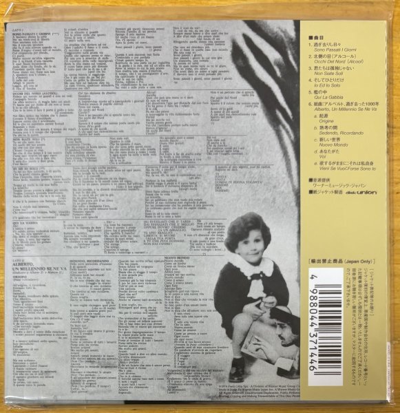 【 収録曲 】 1. Sono Passati I Giorni - 過き去りし日々 (5:43) 2. Occhi Del Nord (Alcool) - 北側の目(アルコール) (7:53) 3. Non State Soli - 君たちは孤独じゃない (4:43) 4. Io Ed Io Solo - そしてひとりだけ (6:35) 5. Qui La Gabbia - 檻の中 (4:57) 6. Alberto, Un Millennio Se Ne Va - 組曲:アルベルト、過ぎ去った1000年 (22:07) 6a. Origine (Frase Circolare) - 起源 6b. Sedendo, Ricordando - 熟考の間 6c. Nuovo Mondo - 新しい世界 6d. Voi - あなたがた 6e. Vieni, Se Vuoi (Forse Sono Io) - 欲するがままに:それは私自身 Total Time 51:58 【 Line-up / Musicians 】 - Tito Schipa Jr. / vocals, piano - Fabio Liberatori / keyboards, Moog - Nicola Di Stasio / electric guitar - Roberto Gardin / classical guitar, bass - Mario Fales / acoustic guitar - Carlo Civilletti / bass - Claudio Barbera / bass - Roberto Cimpanelli / sax - Walter Martino / drums - Ruggero Stefani / drums ※ティト・スキーパ・ジュニアは'73年に発表した2枚組のポップオペラ・アルバム“Orfeo”(Fonit Cetra:LPX 16/17)が割と良く知られており、日本でも人気がある様だが、翌'74年に同レーベルからリリースされた本作もその叙情的な内容が高く評価されている。アルバムには'70年から'73年までに作られた曲が収録されており、B面は組曲編成になっている。acギターをバックにした、独特の語りかける様な歌唱がたまらない魅力となっており、それをピアノ、ストリングス等が見事に引き立てている。ポップな面はさ程見受けられず、M.ペロシの暗さとも一線を画した、“感傷的”とも言える音作りが支配的となっており、歌物の中ではチロ・ダミコ等と並び非常にアピールカのある作品となっている。'79年、スペシャル3000シリーズで再発されている(Fonit Cetra:SFC218)。 ( イタリアン・ロック集成より ) 【 参考音源 】 TITO SCHIPA JR. | IO ED IO SOLO (1974) |