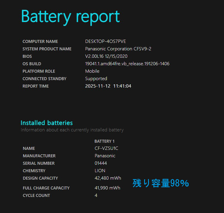 | 型 番 | CF-VZSU1CJS バッテリーの健康状態は98%です |