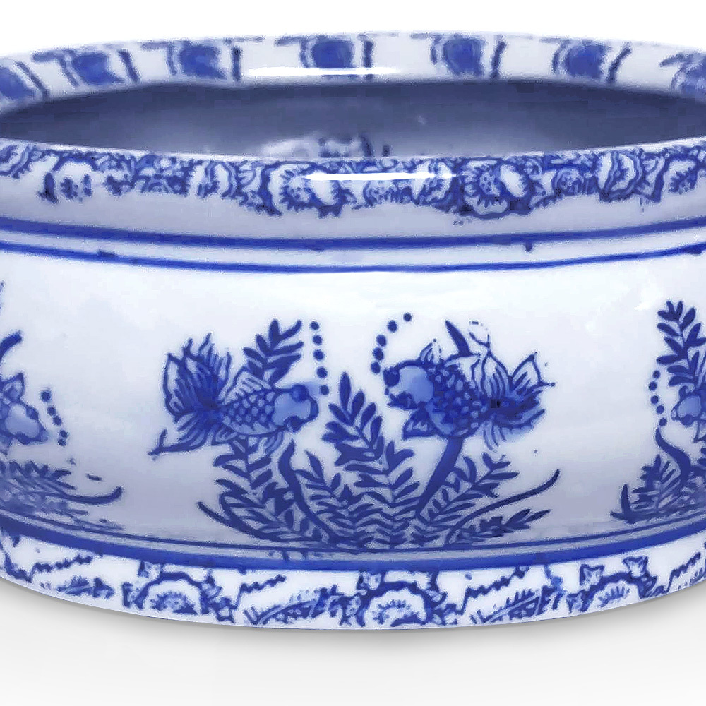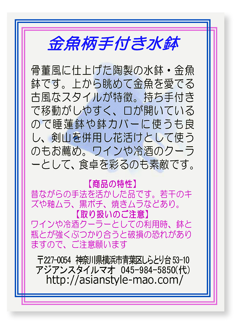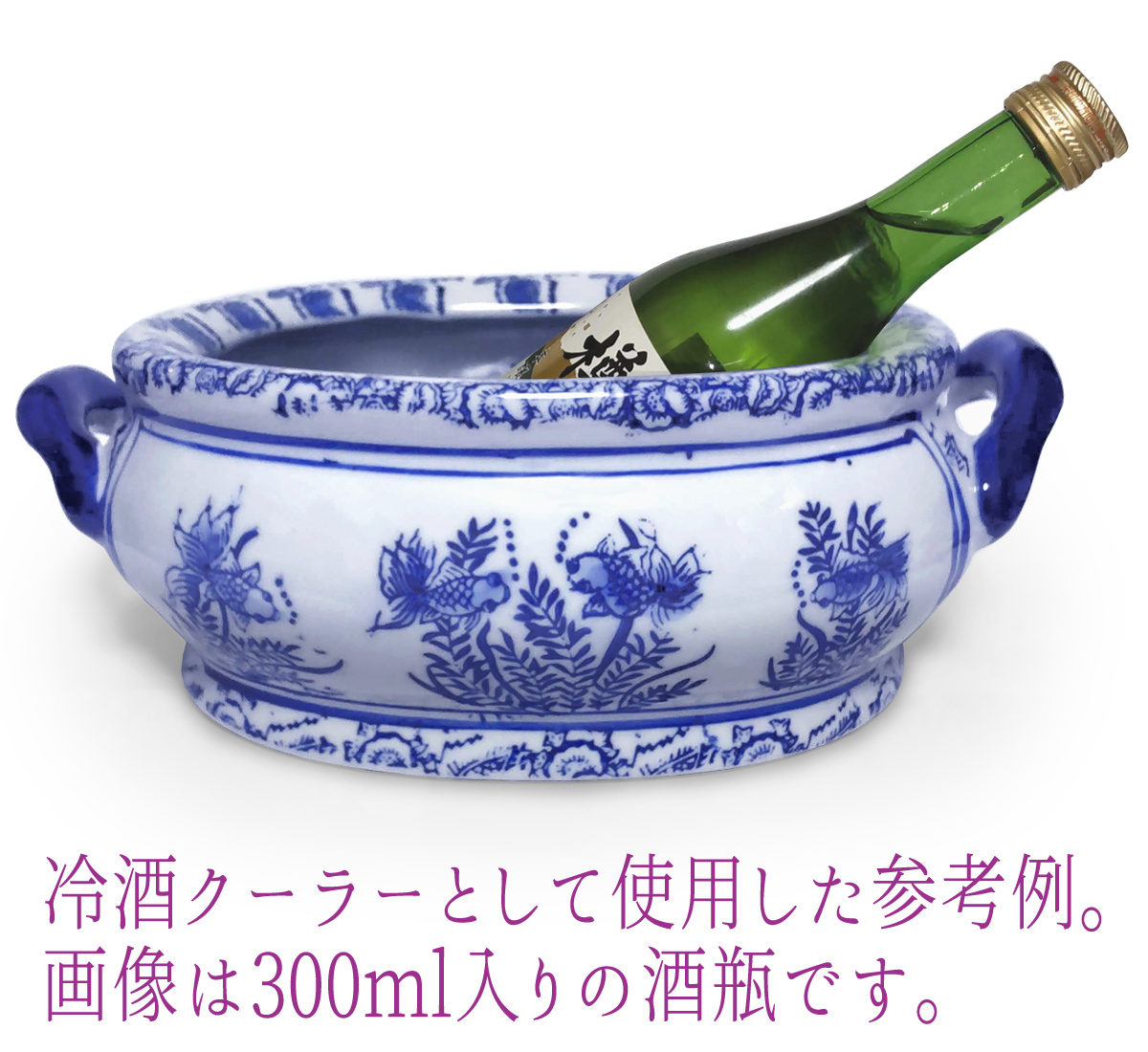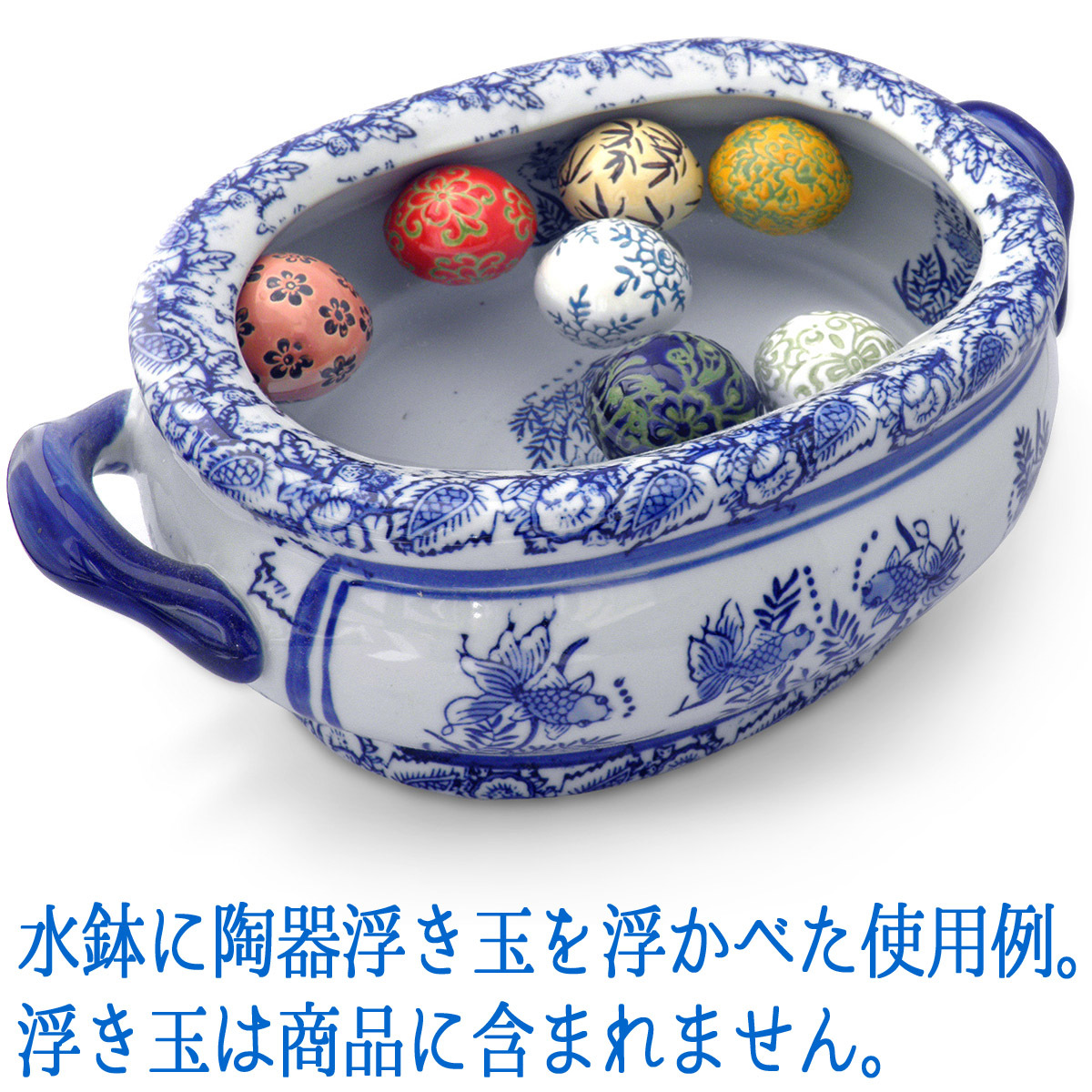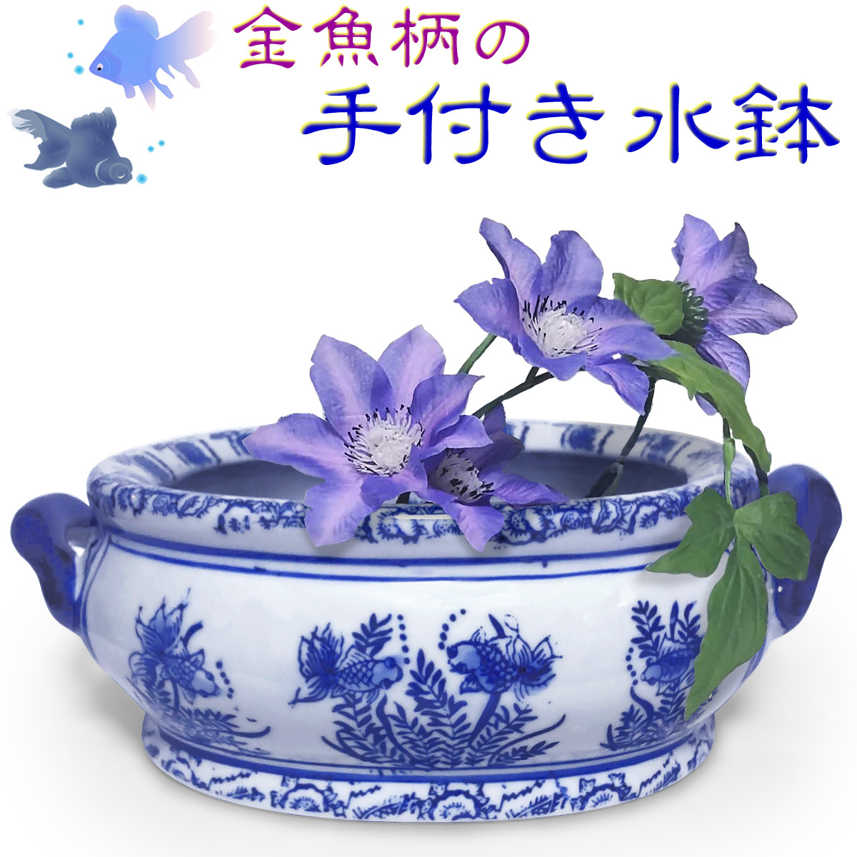 | 染付の技法で金魚と水草の柄をあしらい、アンティーク風に仕上げた陶製の水鉢・金魚鉢です。 ガラス製の金魚鉢とは異なり、上から金魚を眺め愛でるスタイルの品。 古風な趣きを楽しみ金魚やメダカを飼うのはもちろん、水草と一緒に育ててビオトープを作ったり、睡蓮鉢としてお使いになるのもお薦め。剣山を併用し、花器として使うのも素敵です。 持ち手は移動がしやすいという実用と同時に、雰囲気作りにも一役買ってくれています。 どこかモダンな佇まいも印象的で、和室用室を問わずインテリアに華やぎを添えてくれそう。 ▼サイズ 幅29cm、奥行き19cm、高さ10.5cm、内部深さ9.5cm ※手作りの為、品ごとに若干の違いあり。 ▼素材・仕様 染付け陶器、手付き、オリジナル説明書添付 ※商品本体以外の品は撮影用の小道具で、植物・浮き玉・酒瓶は出品物には含まれません。 ▼商品の特性 昔ながらの手法を活かした品です。 釉ムラ、印判ズレ、滲み、カスレ、黒ポチ、ピンホールやブクといった焼成時に発生する窯傷等のある場合がございます。 素朴な手作り品ならではの味わい・特性としてご理解いただけますよう、お願い申し上げます。 ▼取り扱い上のご注意 ワインや冷酒のクーラーとしてご利用の際、鉢と酒瓶が強くぶつかりあうと破損の恐れがございますので、ご注意ください。 |