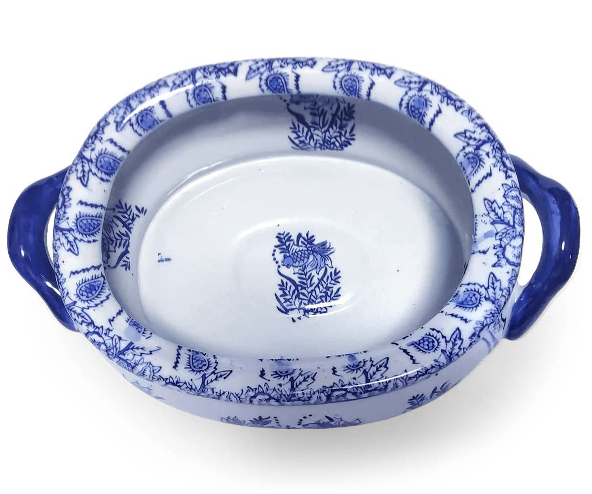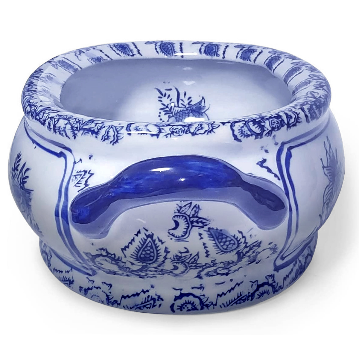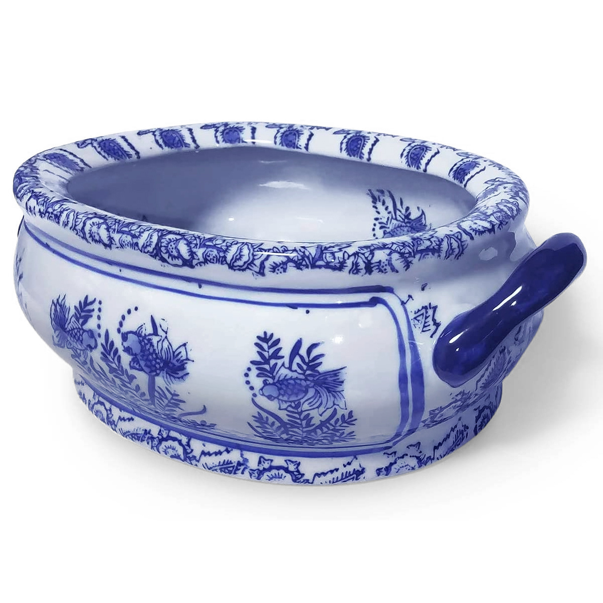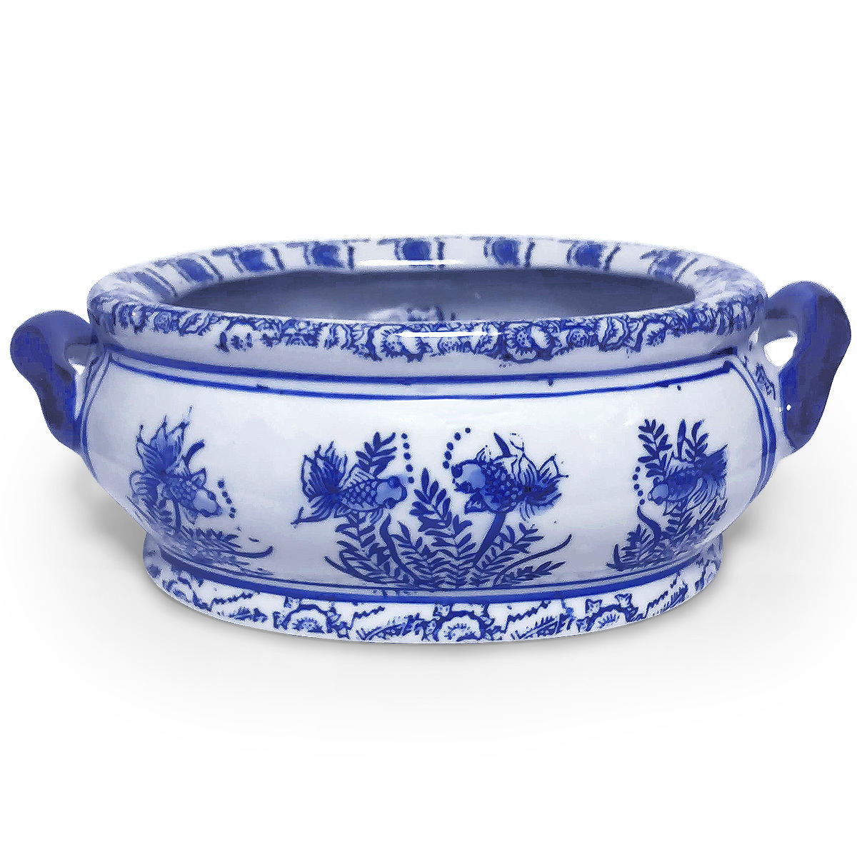 | 染付の技法で金魚と水草の柄をあしらい、アンティーク風に仕上げた陶製の水鉢・金魚鉢です。 ガラス製の金魚鉢とは異なり、上から金魚を眺め愛でるスタイルの品。 古風な趣きを楽しみ金魚やメダカを飼うのはもちろん、水草と一緒に育ててビオトープを作ったり、睡蓮鉢としてお使いになるのもお薦め。剣山を併用し、花器として使うのも素敵です。 持ち手は移動がしやすいという実用と同時に、雰囲気作りにも一役買ってくれています。 どこかモダンな佇まいも印象的で、和室用室を問わずインテリアに華やぎを添えてくれそう。 ▼サイズ 幅29cm、奥行き19cm、高さ10.5cm、内部深さ9.5cm ※手作りの為、品ごとに若干の違いあり。 ▼素材・仕様 染付け陶器、手付き、オリジナル説明書添付 ※商品本体以外の品は撮影用の小道具で、植物・浮き玉・酒瓶は出品物には含まれません。 ▼商品の特性 昔ながらの手法を活かした品です。 釉ムラ、印判ズレ、滲み、カスレ、黒ポチ、ピンホールやブクといった焼成時に発生する窯傷等のある場合がございます。 素朴な手作り品ならではの味わい・特性としてご理解いただけますよう、お願い申し上げます。 ▼取り扱い上のご注意 ワインや冷酒のクーラーとしてご利用の際、鉢と酒瓶が強くぶつかりあうと破損の恐れがございますので、ご注意ください。 |