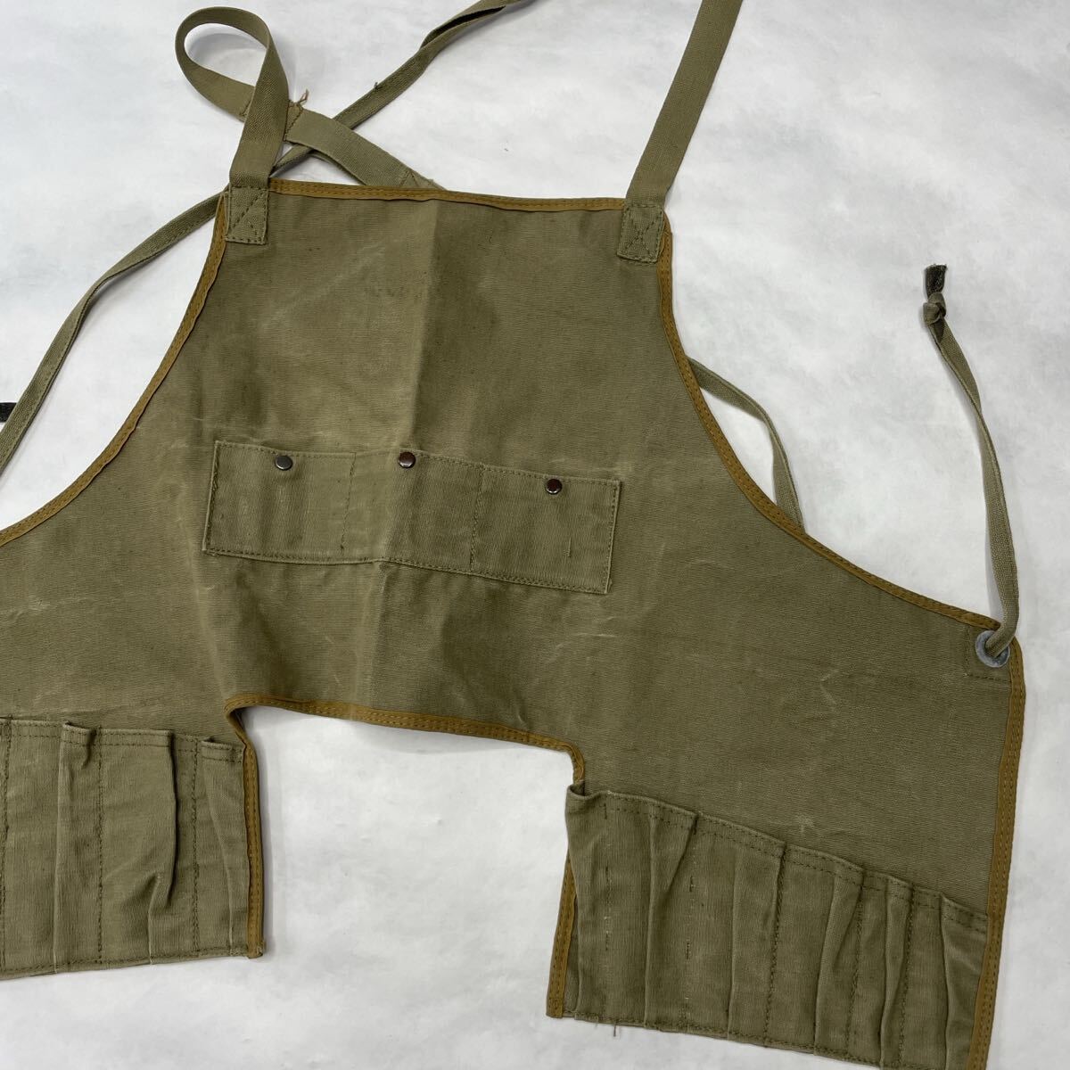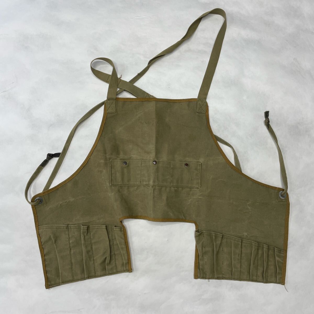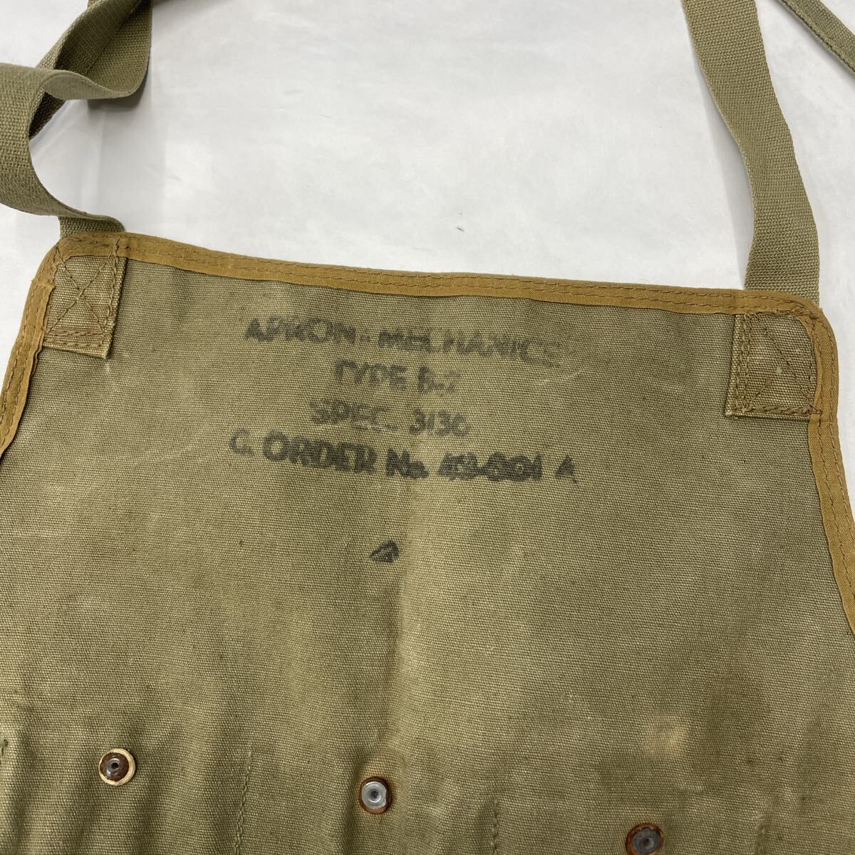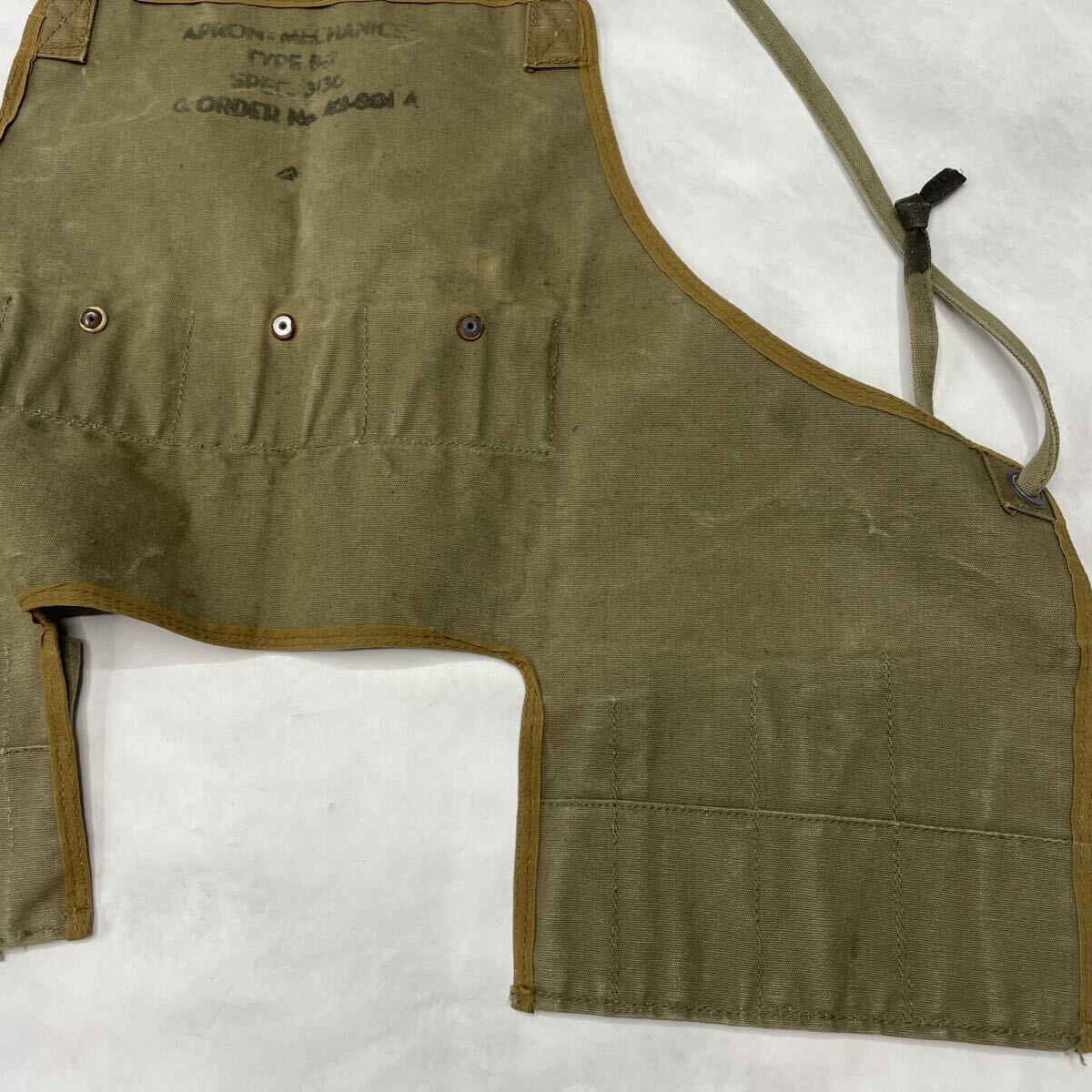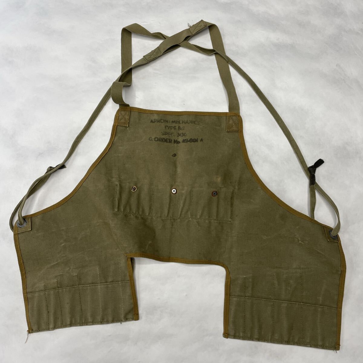 アメリカ空軍の前身にあたるアメリカ陸軍航空隊 USAAF USAAF(United States Army Air Forces,)は1941年にアメリカ陸軍に設立された航空部門。翌42年には、従来は地上部隊の指揮のもと活動していた陸軍航空隊を統合する為、生産期間も短く非常に希少なアイテム。 ドライバーやレンチ等を入れるポケットが特徴的な1着。 内側のステンシルにもあるようにB-2、メカニックエプロン。43年製です。 ダック地を使用した丈夫な作りで、しゃがんだりし易い考えられたデザイン。 カラーはフェードしたカーキの様な色合いです。 小分けのポケットは中央はスナップ留め、ステッチ、パイピング等は本当に作りがしっかりとしています。 エプロンですが、VEST感覚で着用いただければと思います。