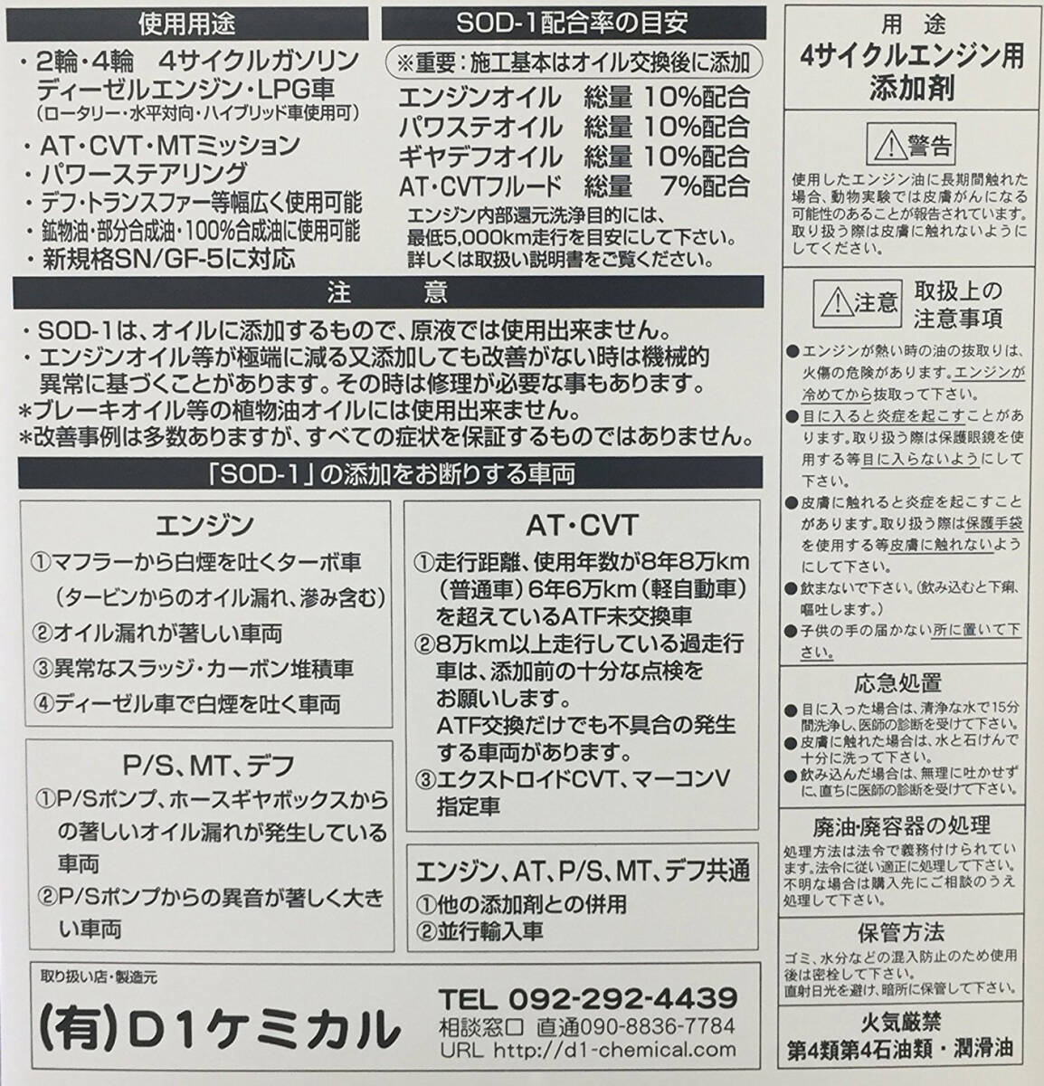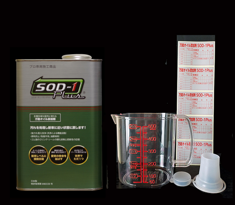 【SOD-1 Plus】1L 2023年7月~新パッケージ版 エステルをベースとして製造された化学合成オイル添加剤で、 エステルが持つ特性を最大限に生かして、幅広い種類の潤滑油に 対応可能にしています。車の使用過程(走行5,000kmを目安) におけるエンジン油圧を利用した循環系統付着物の還元と 性状アップを目的とした予防整備製品です。 排気ガスのCO、HC低下、燃費の改善、 ローコストで各潤滑油に関わるトラブルを解消する事から まさに幅広い意味でのエコオイルと言えます。 ●強力な洗浄効果で機械内部をクリーンに保つ ●高温・高圧に強い油膜を保持して摩耗を防止 ●優れた潤滑性で金属同士の直接接触摩耗を防止 ●ゴム膨潤作用によってオイル滲み・漏れを改善 ●これ1つで多種多様な箇所に使える多様性を実現 ●計量カップ/ノズル/メンテナンスシール付属 |