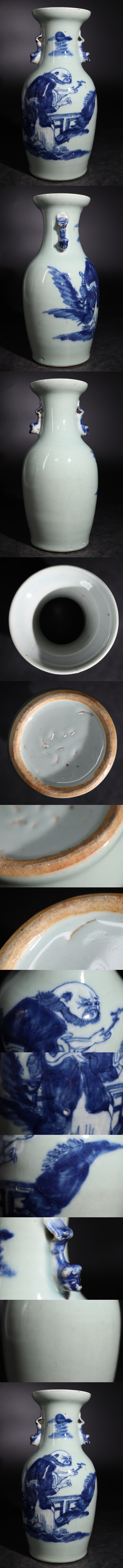 | 時代 染付 青磁 人物文 双耳 花瓶 / 中国美術 花器 壺 煎茶飾 検索: 清 新渡 .G3081 |