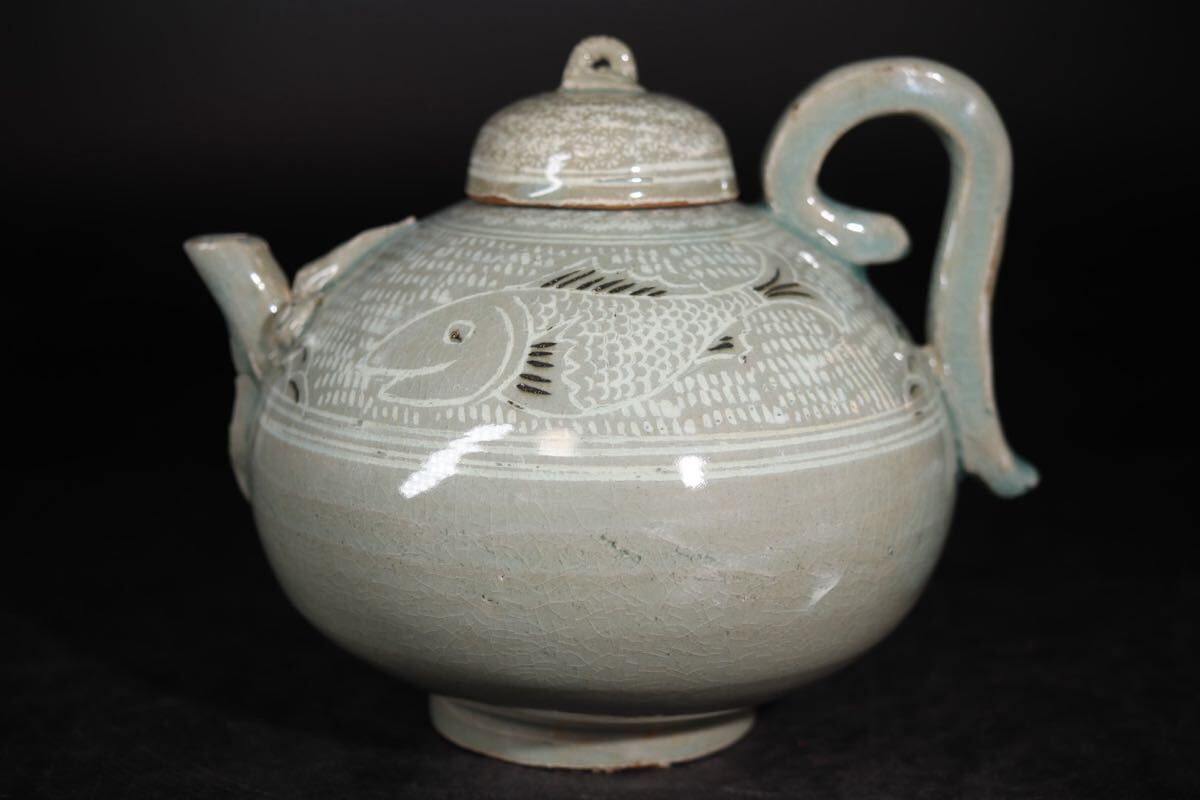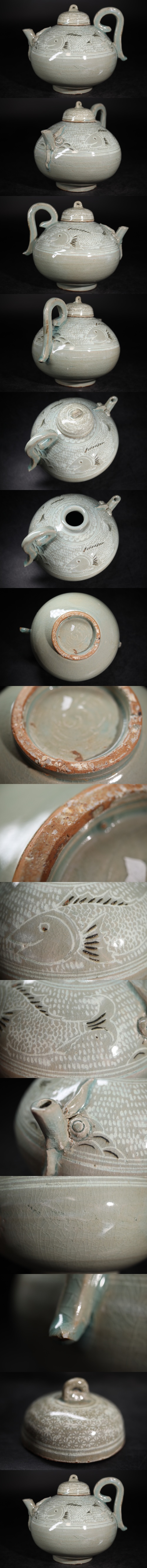 | 時代 高麗青磁 魚文 白黒象嵌 急須 / 朝鮮古美術 李朝 高麗 青磁 水注 茶器 煎茶道具 .G3079 |