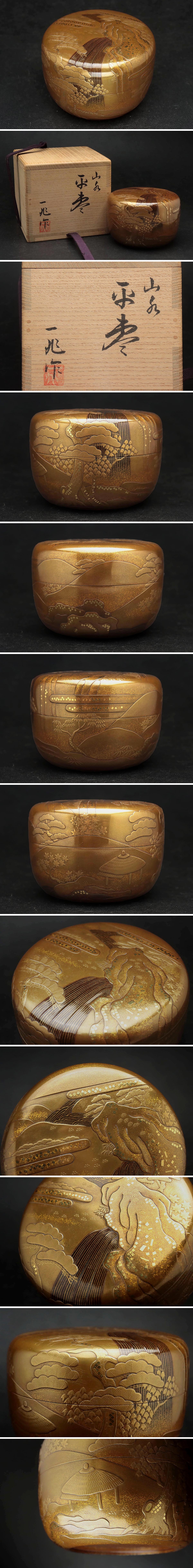 | ◆ 蒔絵師【一后一兆作】金地/内金梨地 山水滝高蒔絵 平棗 径8.5cm 共布/共箱附・金蒔絵棗 秀逸 茶道具 ◆