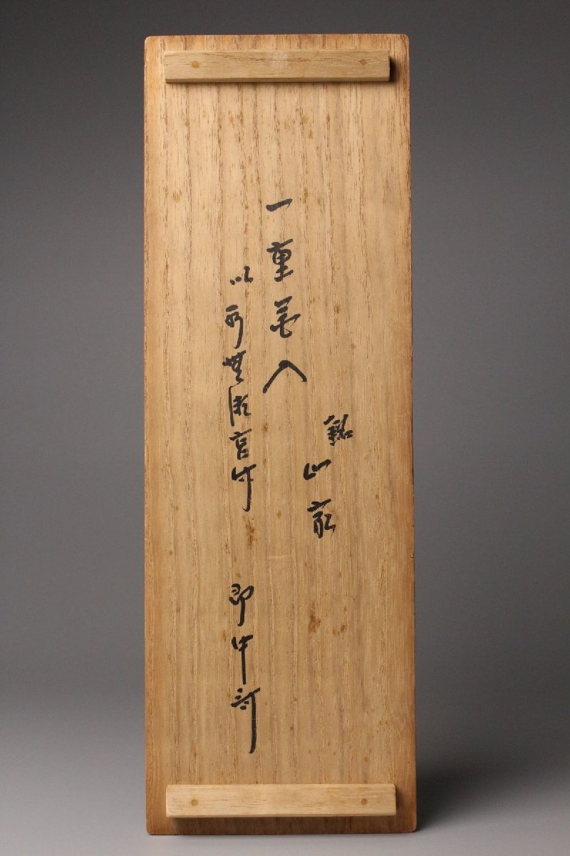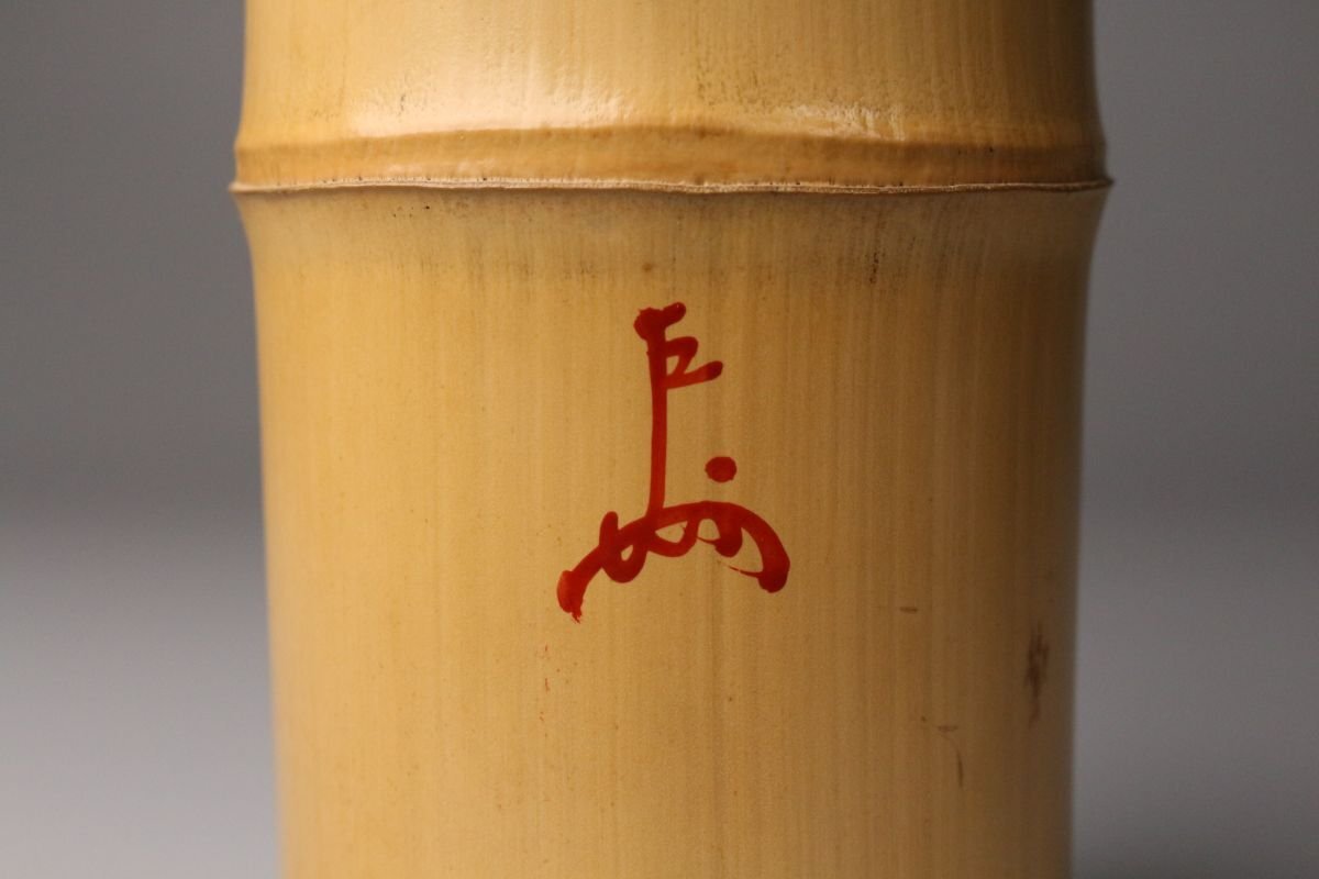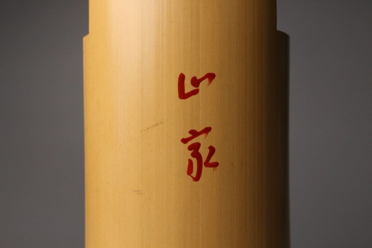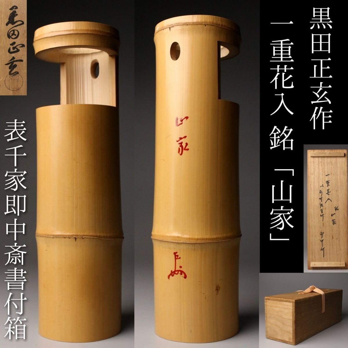 [.WR]25.11 25110921A* * * 商品詳細 * * * ここでしか出逢うことのできない唯一の美をご紹介させて頂きます。 黒田正玄作 一重花入 銘「山家」表千家即中斎書付箱 千家十職の中でも花所において名高い黒田家の流れを汲む、正玄の手による一作です。 竹の自然な姿を生かした一重花入は、素朴さの中に確かな品位と緊張感を宿し、まさに茶の湯の精神「侘び寂び」を体現しています。銘「山家」が示すように、山里の静けさや自然の息づかいを映した趣深い作品です。 さらに、表千家 即中斎宗左による書付箱を伴い、花押在判の確かな証をもつ由緒正しき花入。 竹の節目や肌理に宿る時の風合いが美しく、花をひと枝添えるだけで、空間に格別の静謐をもたらします。 ■商品内容/ 花入、書付箱 ■サイズ/横8㎝×高30.5㎝ 箱:横11㎝×高12.5㎝×奥行33㎝ ■状態/ スレ、小傷、汚れ、割れ、箱にスレ、傷、汚れがございます。 ※写真にてご確認、ご了承の上ご入札下さい。