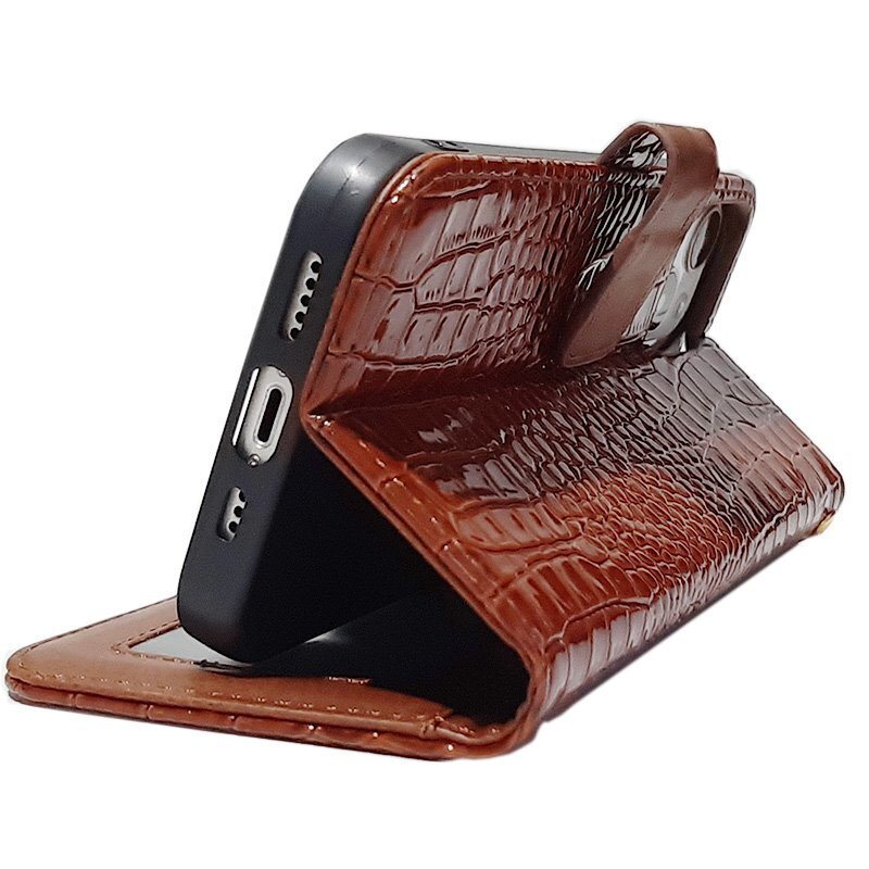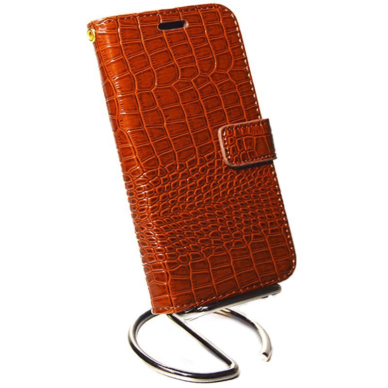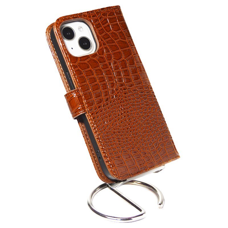 ■ 形状:手帳型 (マグネット付着) / 折り畳みスタンド / 内側カード収納ポケット / ハトメストラップホール加工あり | 付属品:クロコダイル柄ストラップ