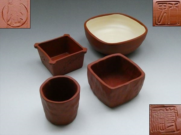 | ★商品★ ・朱泥四方小鉢:3点 ・朱泥ぐい呑:1点 ※計4点の出品となります。 ★寸法★ <小鉢> ・高さ (約)4〜4.5cm ・直径 (約)7〜11.5cm <ぐい呑> ・高さ (約)5cm ・口径 (約)5cm ★状態★ ・経年による多少の汚れが見られます。 ・欠けなどの破損箇所は見られません。 ※備考※ 商品状態に関しては、あくまでも当方の見立てとなります。 程度には個人差がございますので、商品画像を良くご覧になられた上でのご入札お待ちしております。 |