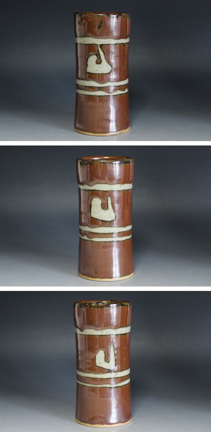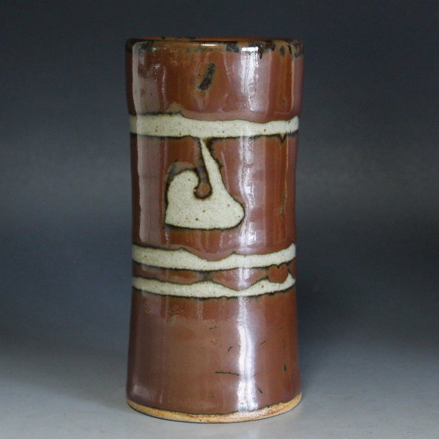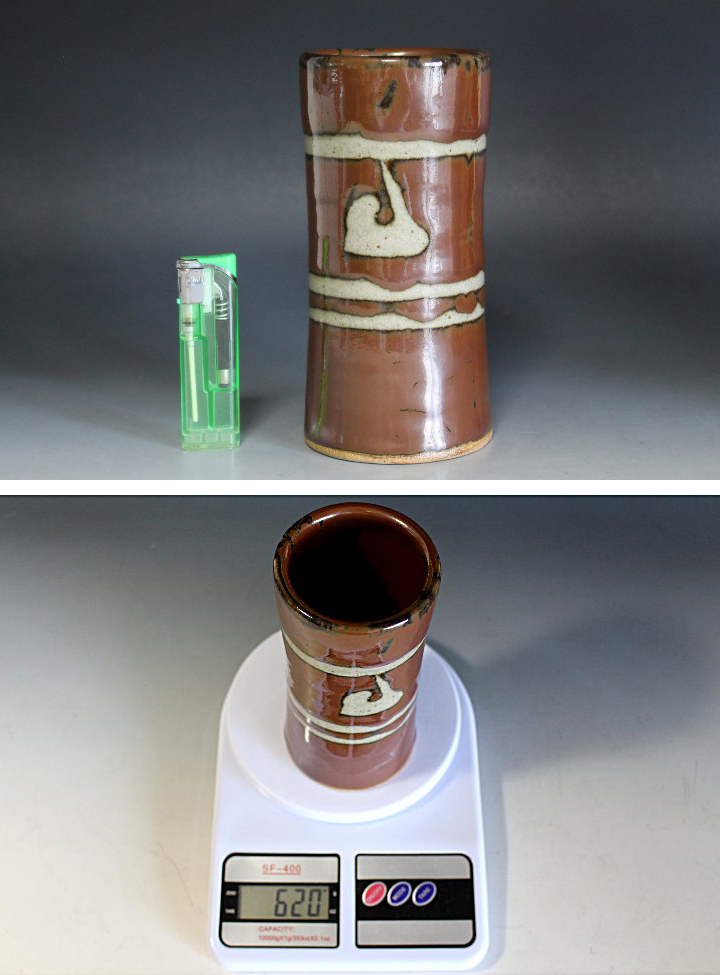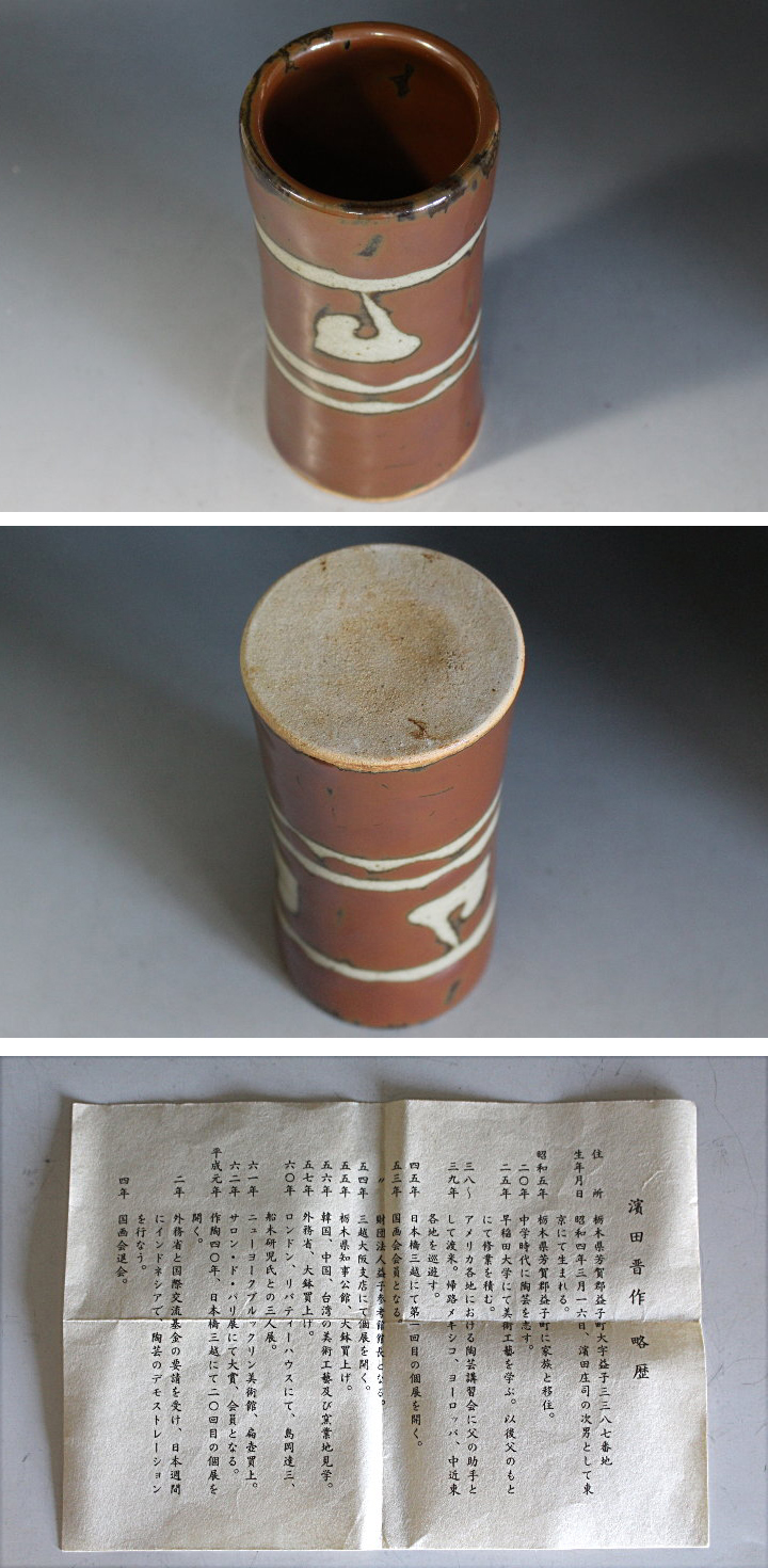 サイズ:高16.0cm 人間国宝/浜田庄司の息子 浜田晋作 花生 です。 柿釉の美しい作品です。 目立つ大きな傷みはありません。 共箱・陶歴付。 写真をご覧の上ご入札宜しくお願い致します。 | |