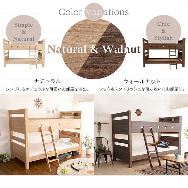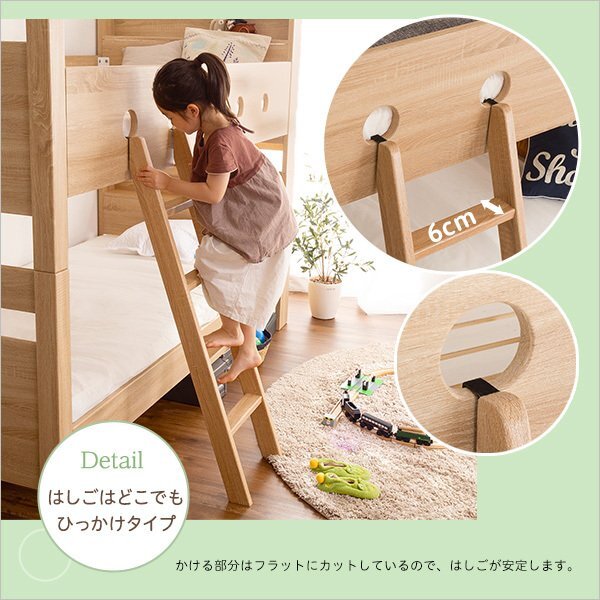 | 【ポイント】 子供から大人まで使えるシンプルデザインの宮付き二段ベッドです。 木目調の3D PVCシート仕様で、本物以上に高級感溢れる仕上がりです。 通気性のあるすのこ床を使用しており、すのこ下の反り止めを3本使用した安心構造です。 耐荷重は約300kgの頑丈設計です。 上段下段を離しても使用できるので、シングルベッド2台としても使用できます。 |