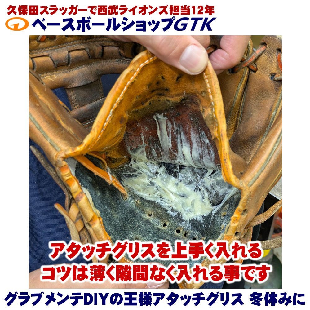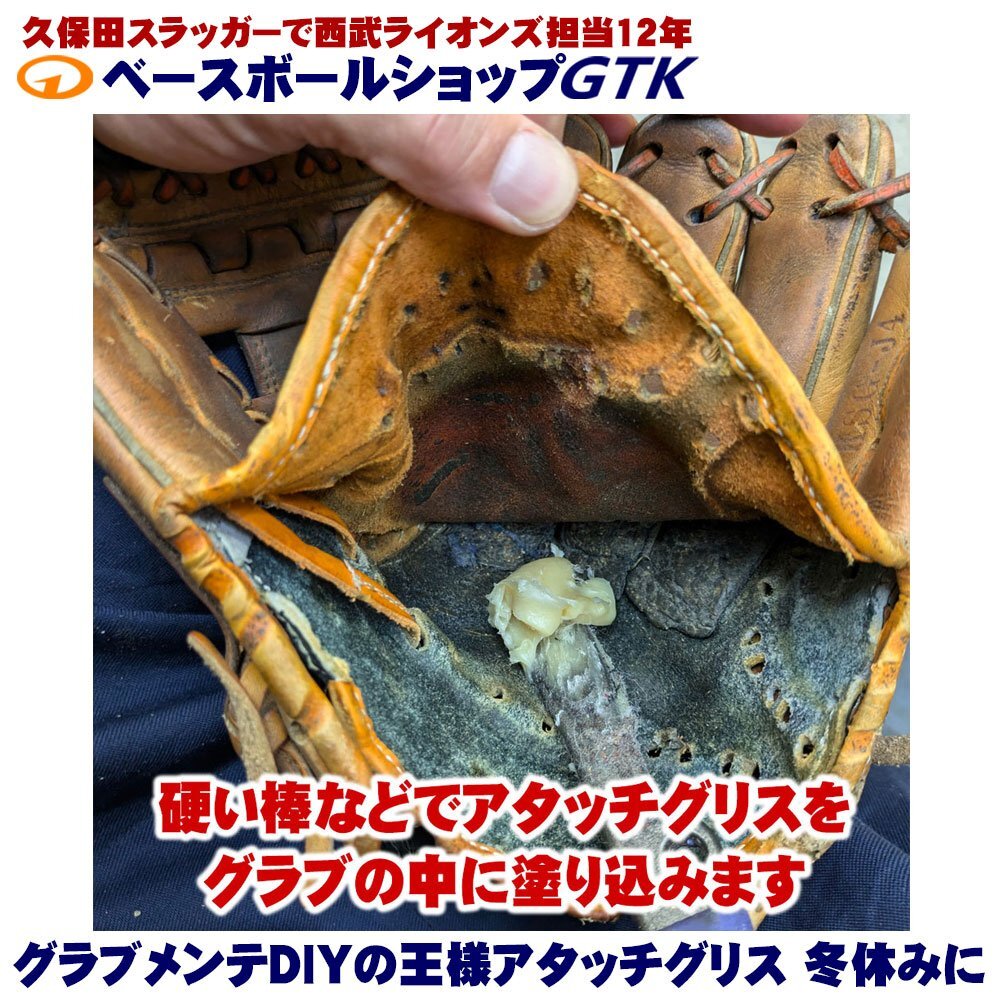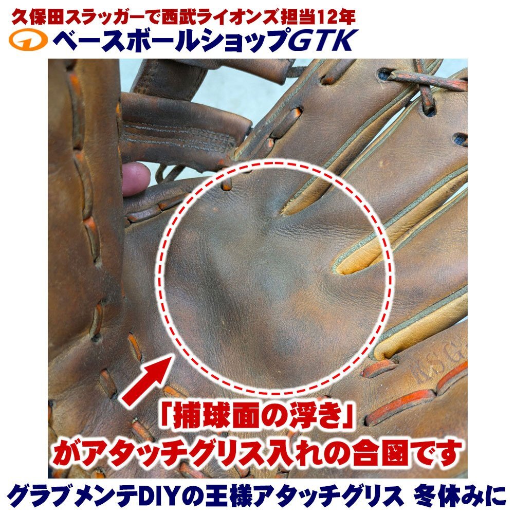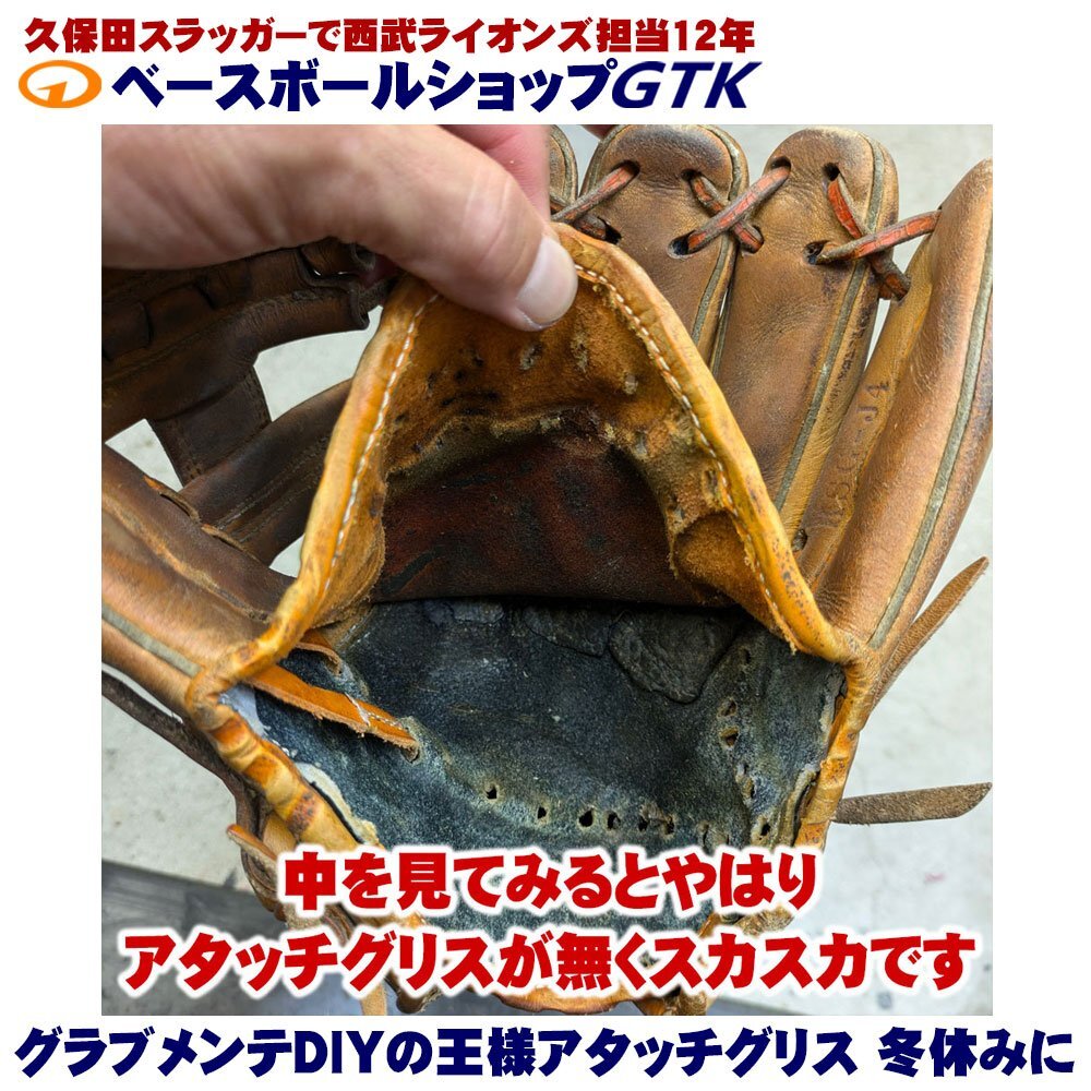 1,650円の商品です。即購入したい場合は「今すぐ落札」ボタンで落札してください。システム上1,650円スタートが出来ませんのでこうしています。 【使用用途】 グラブの捕球面と平裏面(手の平が当たる面)の2枚の革を繋げるグリスです。 グラブを使い込んでいくとグリスが減り革と革の密着が弱まり浮き上がるようになります。 この状態になるとボールを捕ろうとグラブを握った時に平裏の革は動きますが 捕球面の革は動きません!!! は、大袈裟ですがコンマ何秒か遅れが生じますし、うまく力が伝わらず意図した動きにならない場合があります。 こうなったら「アタッチグリス」の出番です。グラブの性能がかなり回復し、元の捕り易いグラブへ戻ります。 新品のグラブには100%入っております。グラブのリフレッシュに最適なアイテムですのでぜひご利用下さいませ。 なお、グラブの分解に自信が無い方は当店にて加工を行いますのでお問い合わせ下さい。 【内容量】 8cm×6cm×3cmの容器に入っています。重量は容器込みで100g前後です。多少前後しますのでご了承下さい。 グラブや硬式ボールは付属しませんのでご了承ください。 日曜・祝日・祭日は定休日のため発送出来ません。翌営業日に発送しますので予めご了承ください。 配送方法は宅配便かメール便です。 それではノークレーム・ノーリターンでよろしくお願いいたします。 | |