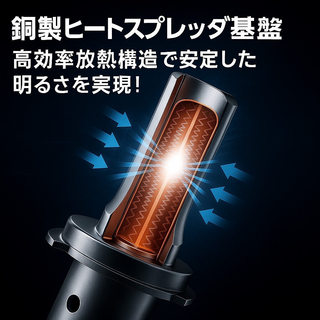 同時点灯式を可能にする為、最新のLEDチップであるCSPチップや銅製のヒートスプレッダ基盤を採用し大光量、低電力、耐久性の向上しています。
